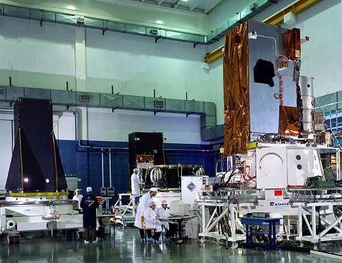 Different models of the INTEGRAL spacecraft in Alenia Aerospazio's clean room: left: Payload
