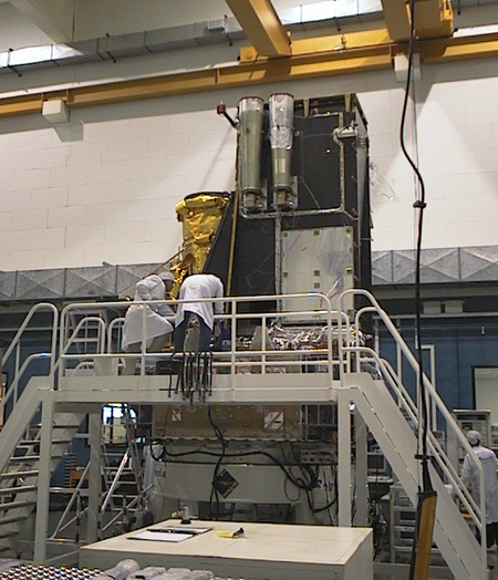 INTEGRAL spacecraft at Alenia before trip to the Netherlands, showing on near side the two star trackers