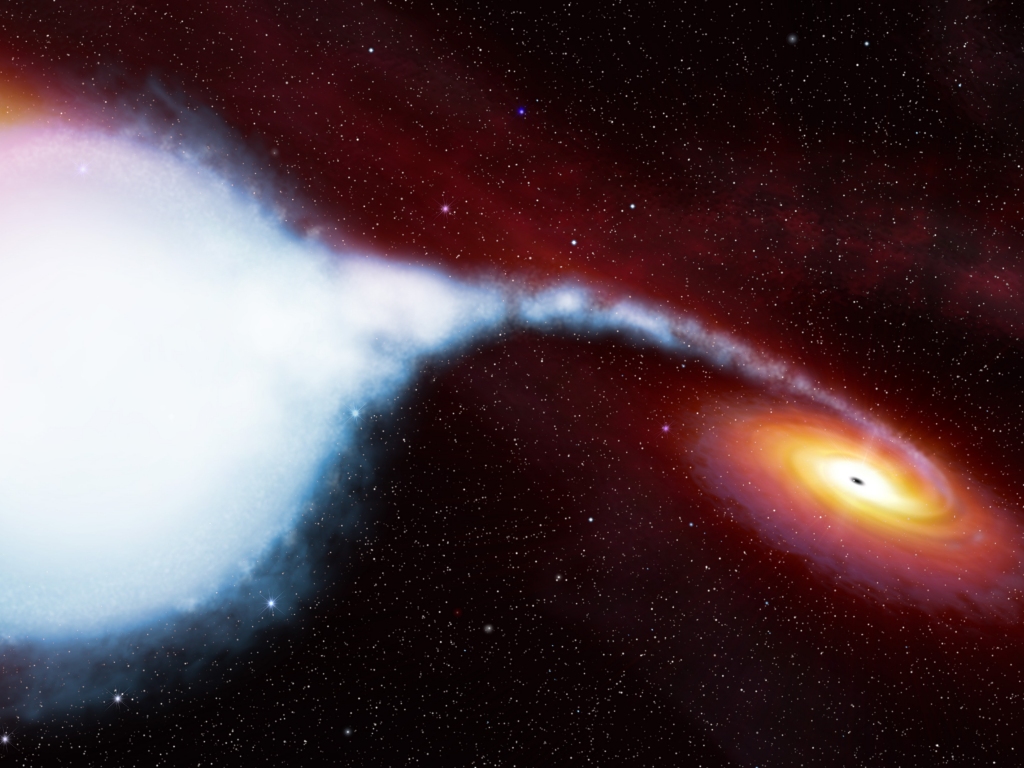Cygnus X-1 is located about 10 000 light years from Earth. It is one of the more violent places in our Galaxy. The black hole, Cygnus X-1, contains about five times the mass of the Sun, squeezed into a tiny sphere a few kilometres in diameter. Because of its density, it possesses an enormous gravitational field, which is pulling matter away from its companion star, HDE 226868. The companion is a massive star, known as a blue supergiant. It has an extremely hot surface temperature of 31 000K. As the gas spirals towards the black hole, it is heated even further and gives off X-rays and gamma rays. Uniquely, Integral can detect all these types of radiation.