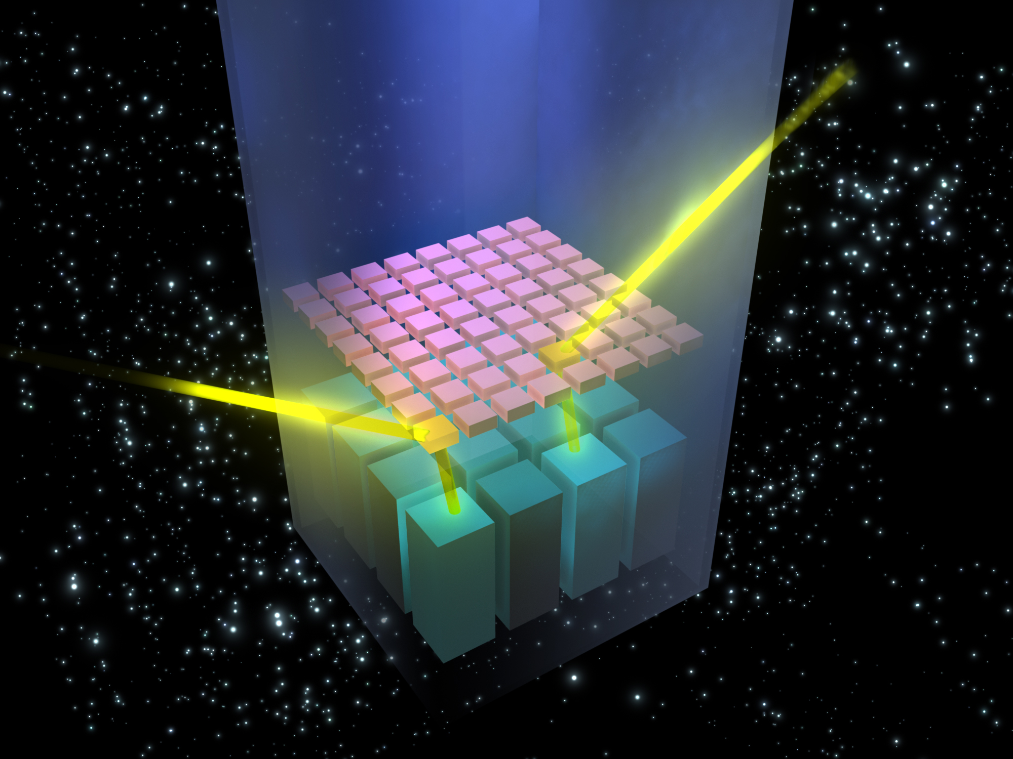 This artist's impression provides a schematic view of how IBIS (Imager on-Board INTEGRAL Satellite) can reconstruct images of powerful events like gamma-ray bursts (GRBs) using the radiation that passes through the side of INTEGRAL's imaging telescope.