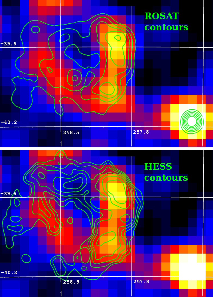 Superposed in green are the surface brightness contours in the soft (0.1-2.4 keV) X-ray band mapped with ROSAT (top panel) and in TeV gamma-rays obtained with the H.E.S.S. telescope (bottom panel).