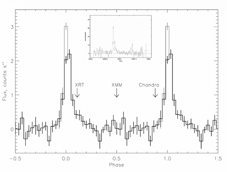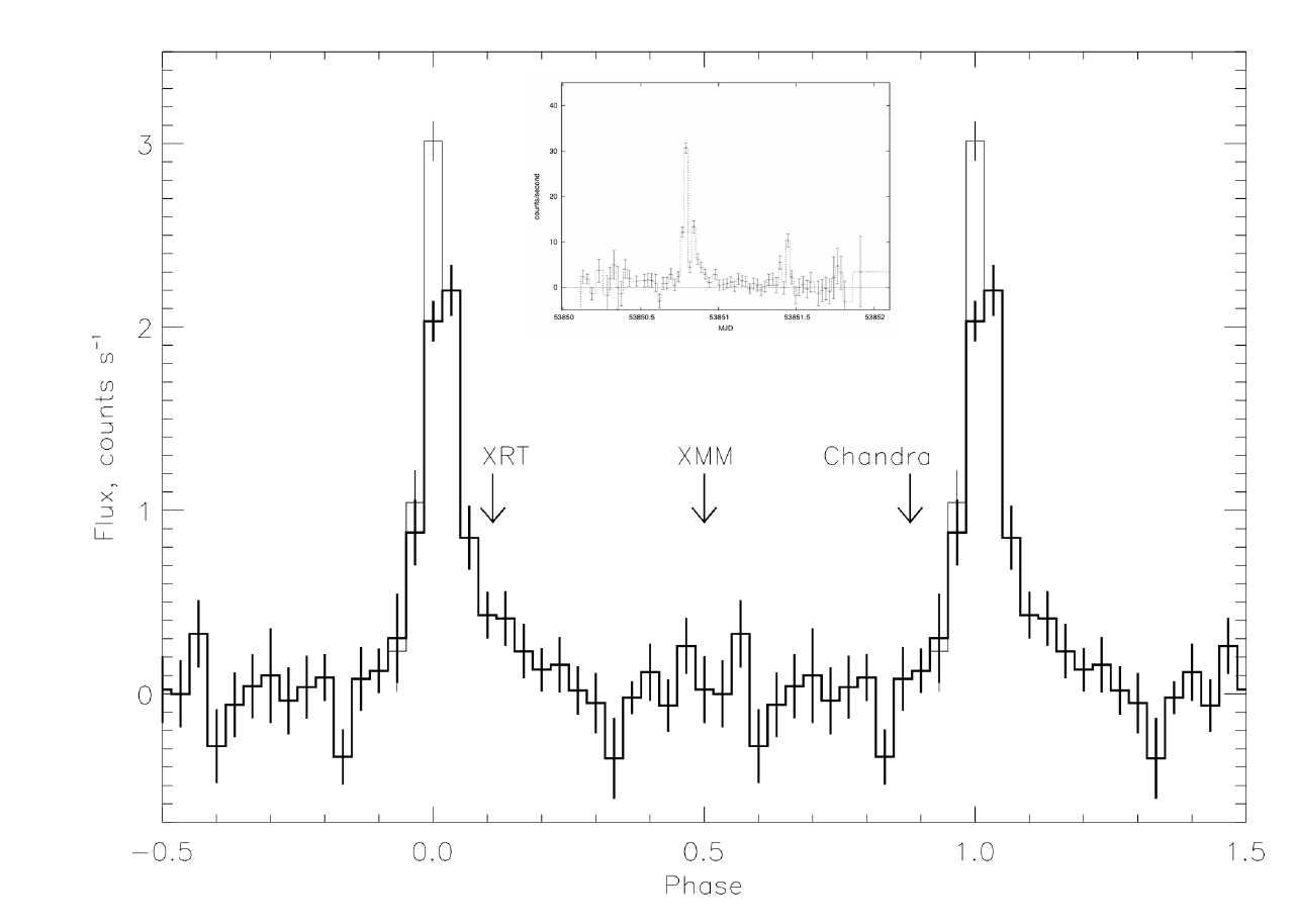 Further analysis of IBIS/ISGRI and Swift/BAT lightcurves show a high level of recurrence from the source, with several new outbursts detected, and significant emission from the majority of periaston passages. X-ray measurements made of the binary system prior to the discovery of the periodicity (shown by the arrows) were unfortunate to miss the emission, but give a strong upper limit on the quiescent flux from the system. The inset image shows one of the newly discovered outbursts, showing the fast transient activity that led to this source being characterised as a supergiant fast X-ray transient (SFXT). Several of the SFXT systems have now been shown to display periodic outbursts with a wide range of periods.