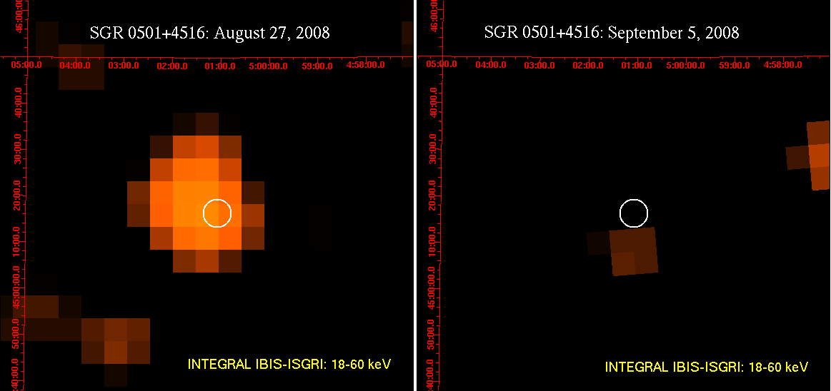 Depicts: Transient high energy X-ray emission from SGR0501_4516 as observed by INTEGRAL.