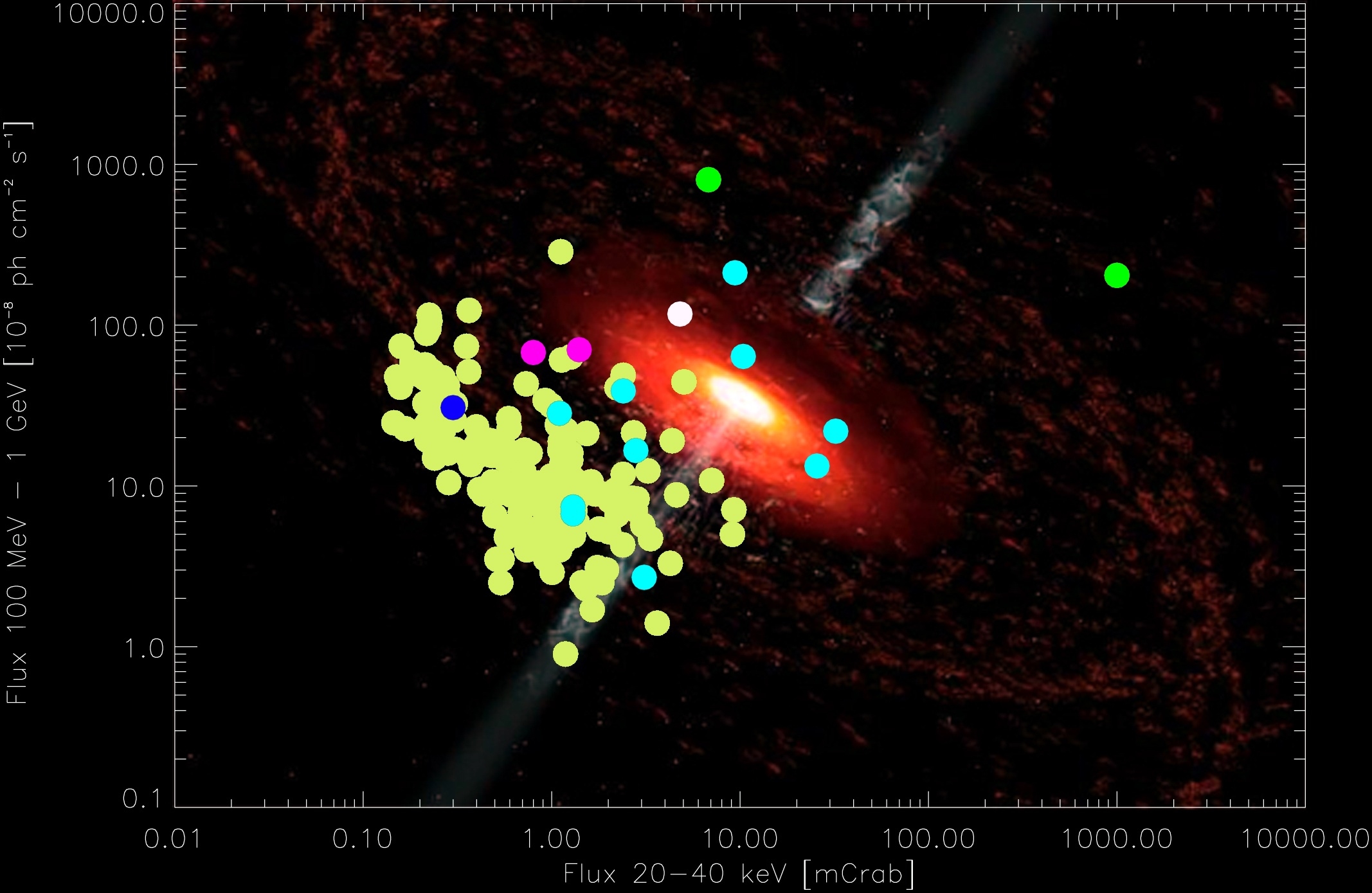 The figure above shows the gamma-ray flux (100 MeV-1 GeV) of each Fermi source as a function of the corresponding 20-40 keV IBIS flux. Light blue points are blazars, green are pulsars, magenta are HMXBs, dark blue is Eta Carinae, white is IGR J17459-2902 and finally yellow points refer to sources emitting at high energy and not in the IBIS range (2 sigma upper limits).