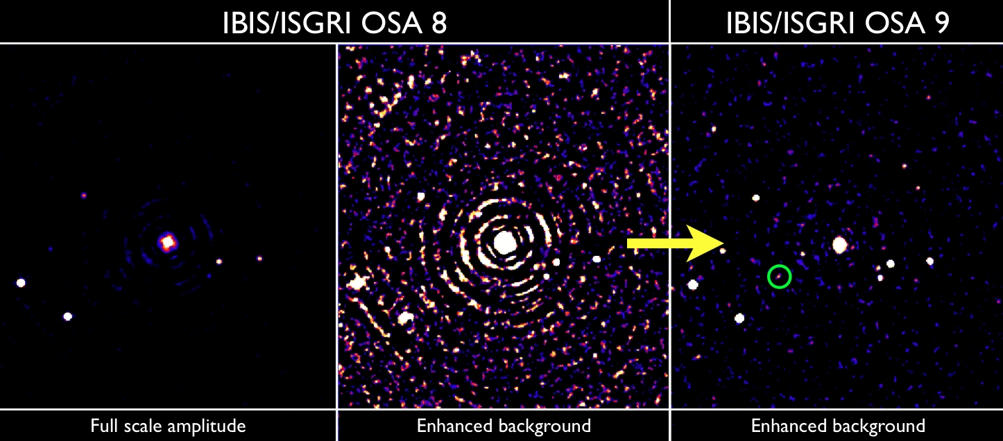 Thanks to an extensive in-flight calibration effort this glue could be modelled much better, reducing the artefacts by a factor of 10 for OSA 9 (right panel). In this image, new faint hard X-ray sources could now be detected for the first time. The source in the green circle, for example, is two thousand times fainter than Cygnus X-1.