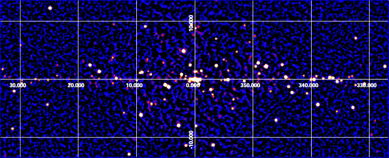 This image is a map of a region near the Galactic Plane, acquired with IBIS/ISGRI on board INTEGRAL, and covering the the 17-60 keV energy band. The total exposure is of about 20 million seconds in the region of the Galactic Centre, the central area of the map.