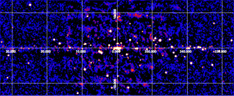 This image is a map of a region near the Galactic Plane, acquired with IBIS/ISGRI on board INTEGRAL, and covering the 17-60 keV energy band. The total exposure is of about 20 million seconds in the region of the Galactic Centre, the central area of the map.