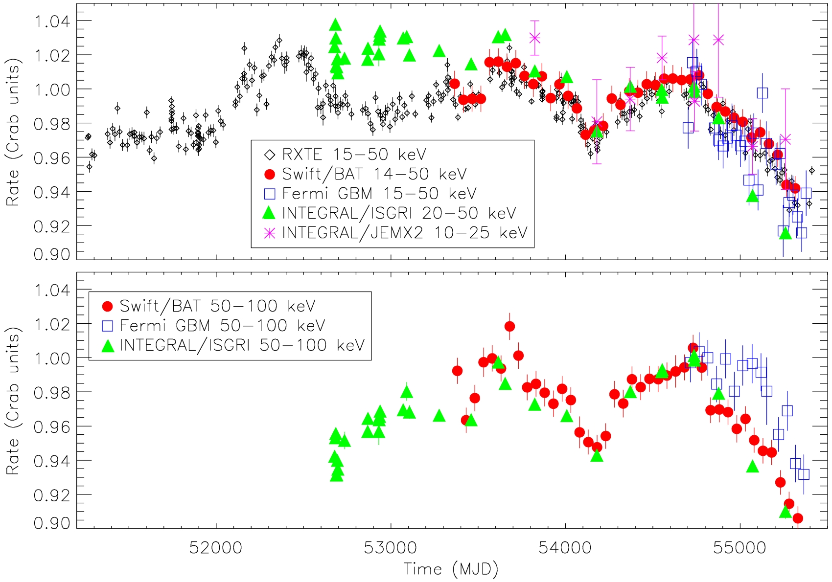 This graph shows the light curve of the Crab Nebula over a time interval of over 10 years, from 1999 to 2010. The data shown in the plot were gathered by NASA's Fermi Gamma-Ray Burst Monitor (Fermi/GBM), Swift Burst Alert Telescope (Swift/BAT), and Rossi X-ray Timing Explorer Proportional Counter Array (RXTE/PCA) as well as two instruments on board ESA's INTEGRAL observatory: the Imager on Board the INTEGRAL Satellite (IBIS) and the Joint European X-Ray Monitor (JEM-X), respectively.