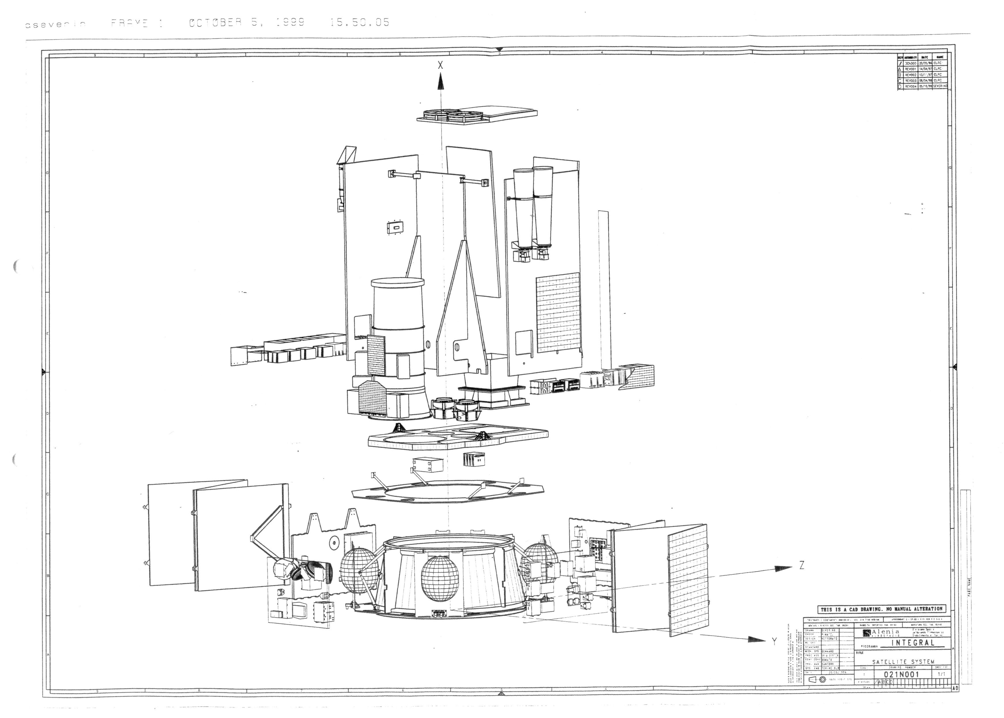 Blueprint shows an exploded view of the INTEGRAL spacecraft Service and Payload Modules.