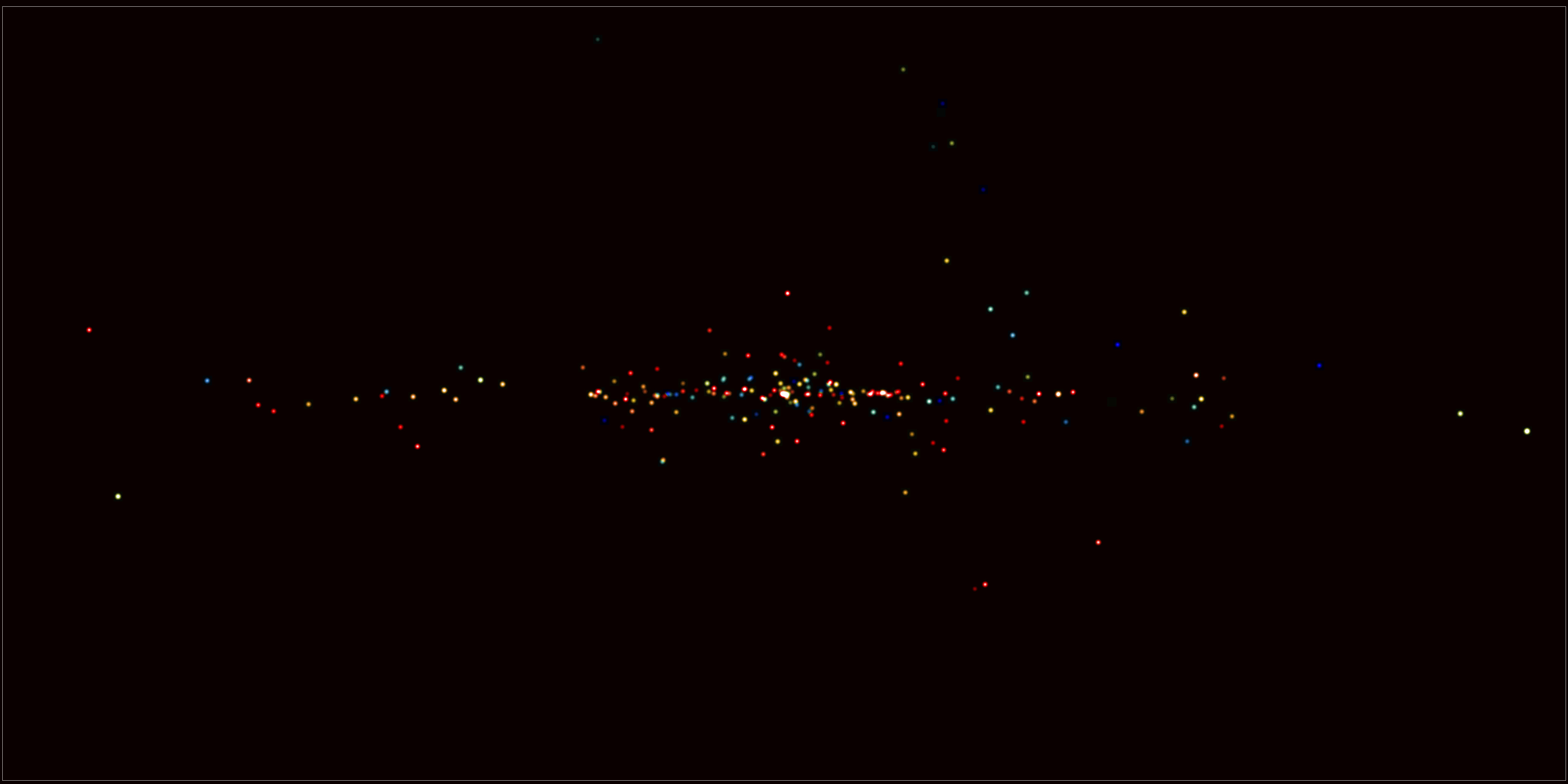 Most of the sources shown in the image belong to our Galaxy, the Milky Way, and are concentrated along the Galactic Plane and Bulge. These objects mainly correspond to the late stages of stellar evolution and are characterised by strong emission in the high-energy end of the electromagnetic spectrum, at X- and gamma-rays.