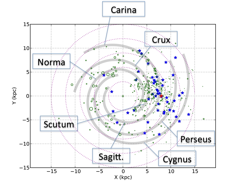 This figure shows the distribution of high-mass X-ray binary stars (blue stars) and star-forming complexes (green circles) superimposed on a model of the Milky Way's spiral arms from Russeil (2003). The red star represents the position of the Sun.