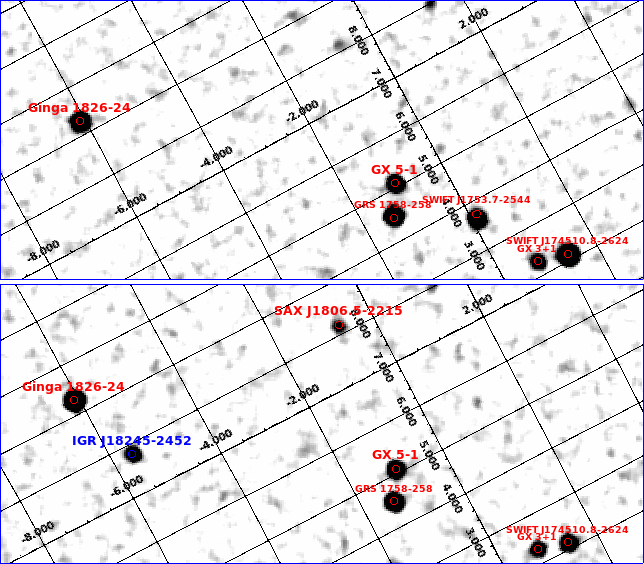 In the later image, the source IGR J18245-2452 is visible (highlighted with a blue label), whereas it is not in the earlier image. Astronomers detected IGR J18245-2452 during a transient outburst of X-rays and identified it as a millisecond pulsar in a binary system. The X-ray outburst activity is caused by the pulsar as it accretes mass from its companion star. This millisecond pulsar is located in the globular cluster M28, which is part of the Galactic Bulge, at a distance of about 18 000 light-years from Earth.