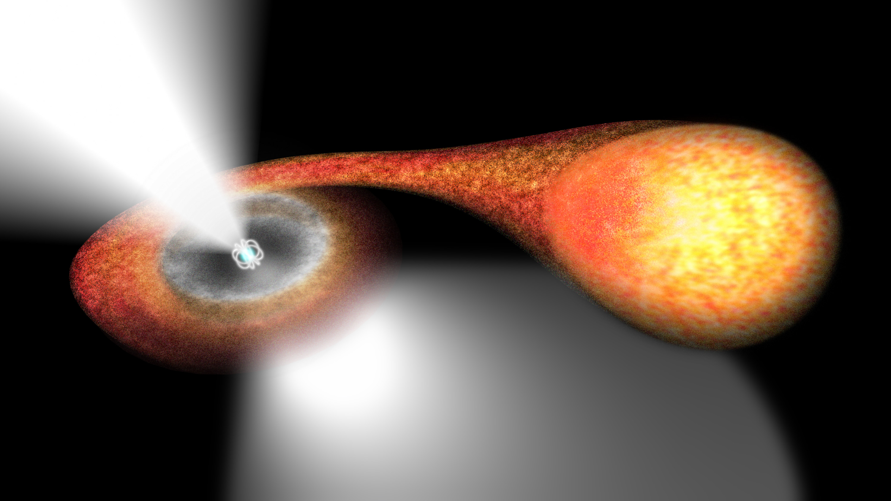 This illustration shows an artist's impression of an X-ray bright pulsar in a binary system with a low-mass star as a companion. When the gravitational pull of the pulsar – which is a very dense object – starts drawing matter from the companion star, the pulsar starts accreting matter via an accretion disc, and emitting X-rays. This emission, supported by the accretion process, is shown as wide, white beams.