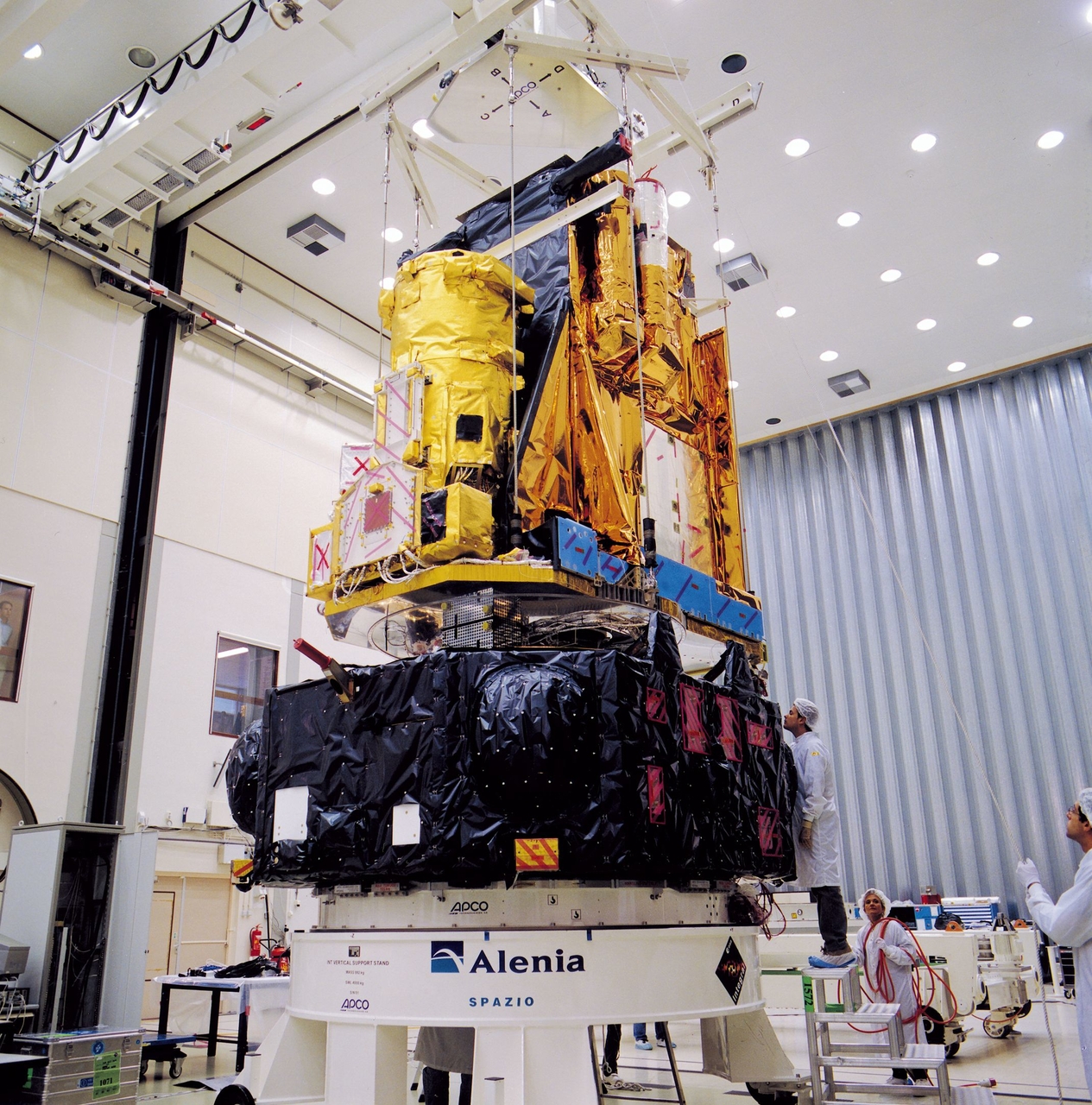 The INTEGRAL spacecraft, without its solar panels, during preparations for test activities in a cleanroom at the European Space Research and Technology Centre (ESTEC) in Noordwijk, the Netherlands.