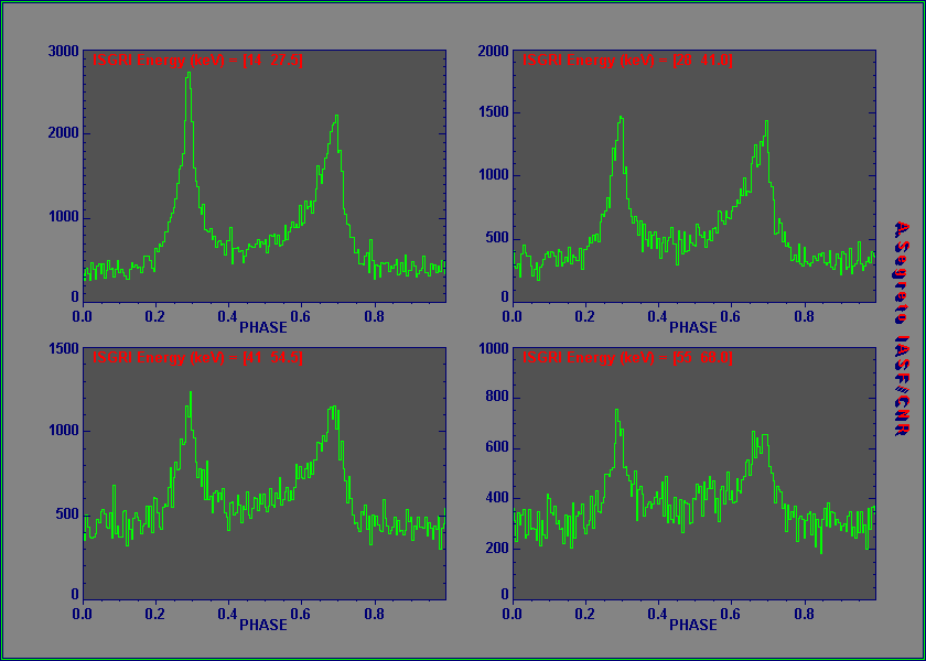 The pulse profile of the Crab Nebula. Each panel shows the profile in a different energy range as measured by IBIS during the February 2003 observations. (Courtesy: Angela Bazzano, Giovanni La Rosa, Alberto Segreto and the IBIS team)