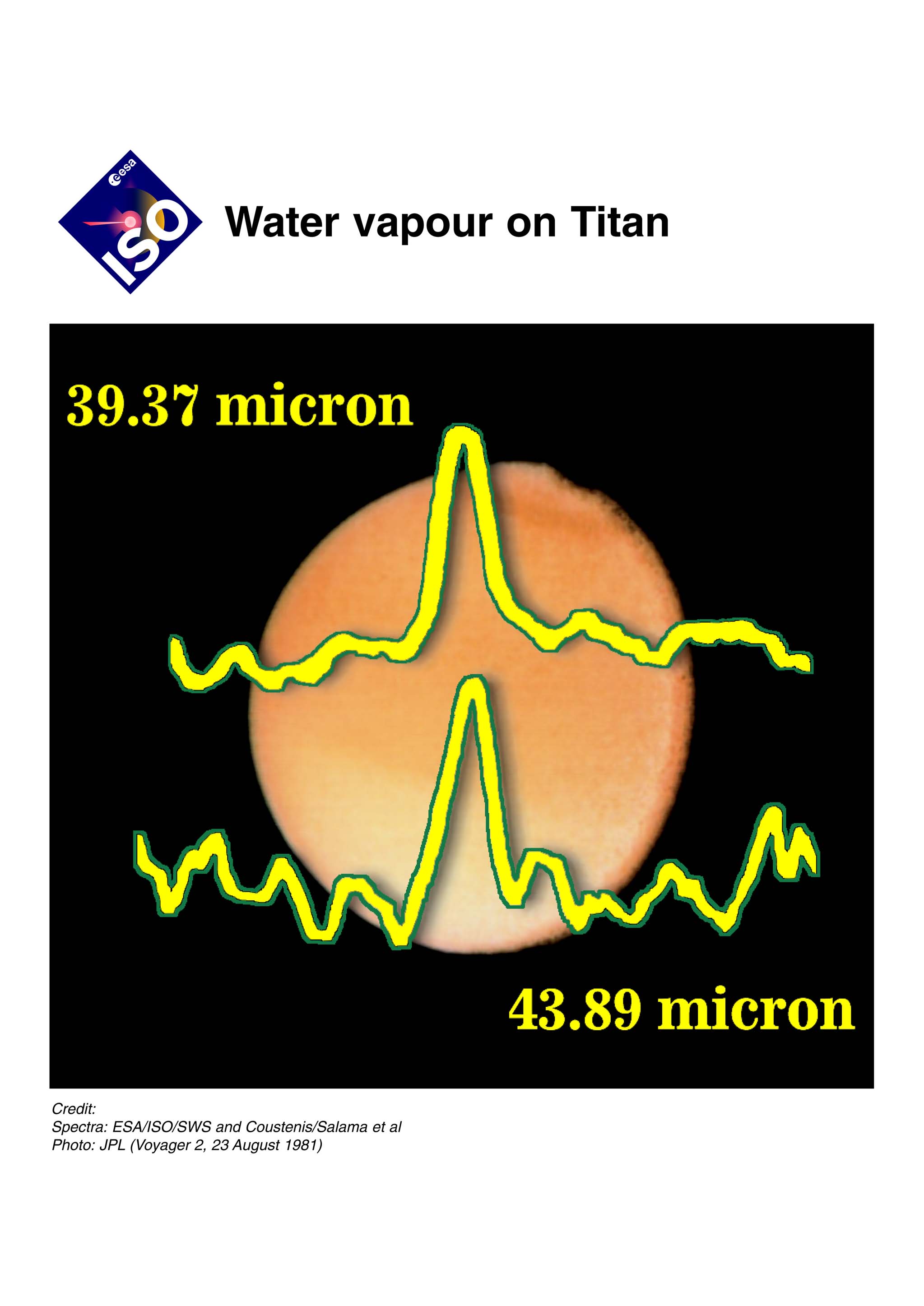 The presence of water vapour in the mysterious atmosphere of Saturn's largest moon, Titan is revealed by infrared emission at wavelengths of 39.37 and 43.89 microns. The European Space Agency's Infrared Space Observatory (ISO) observed Titan with its Short Wavelength Spectrometer during several hours of observations in December 1997, when Titan was at its farthest from Saturn.