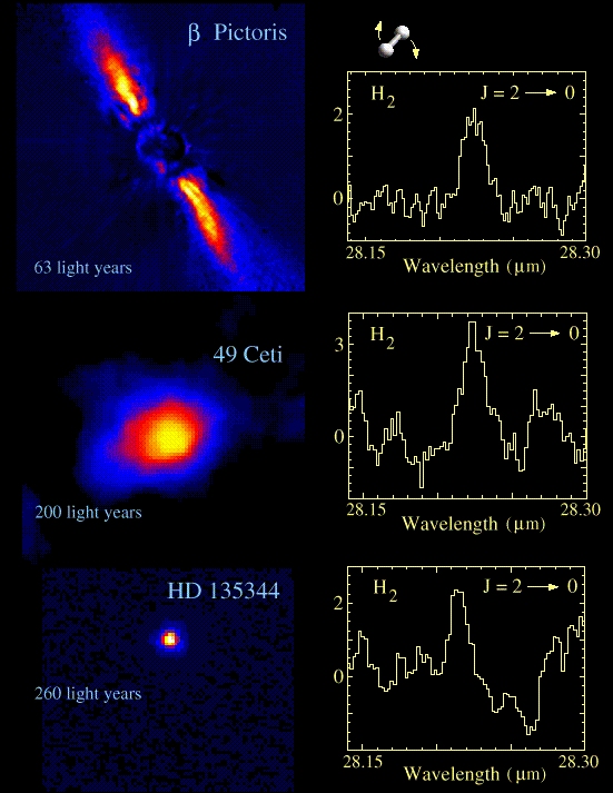 Right column: Infrared Space Observatory Short Wavelength Spectrometer scans of the molecular hydrogen (H2) J = 2 - 0 transition at 28.2 5m from beta Pictoris, 49 Ceti, and HD 135344.