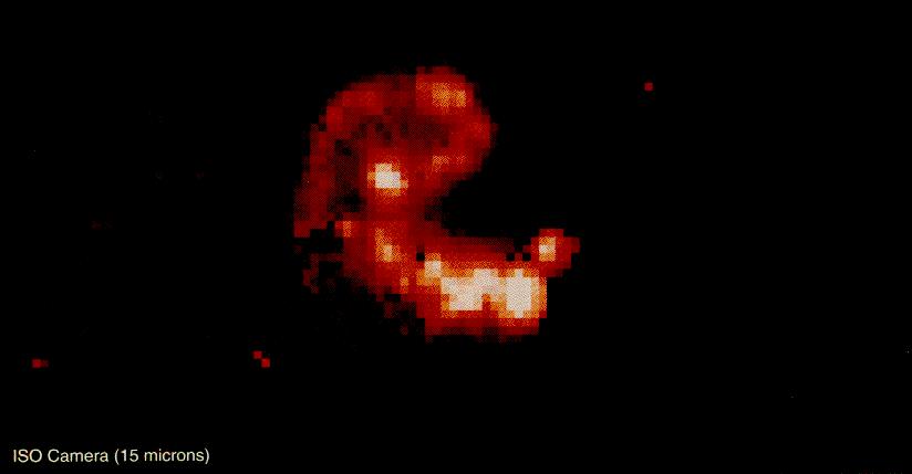 Contrasting regions of intensive star formation appear in infrared light from a pair of galaxies in collision, observed by the European Space Agency's new Infrared Space Observatory, ISO. The Camera in ISO (also called ISOCAM) obtained this image at a wavelength of 15 microns, where the Earth's atmosphere makes cosmic observations very difficult - hence the need for Europe's space telescope dedicated to infrared astronomy.