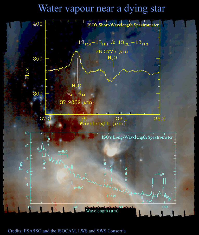 The composite picture shows fingerprints of water vapour (labelled H2O) in widely differing infrared wavebands, as registered by two instruments of ESA's space telescope ISO when it was trained on the elderly star W Hydrae. In a high-resolution spectrum from the Short Wavelength Spectrometer (SWS) the main water feature is the strong emission at wavelengths around 38 microns. The Long Wavelength Spectrometer (LWS) picked up a large number of strong water-vapour emissions at wavelengths from 122 to 183 microns.