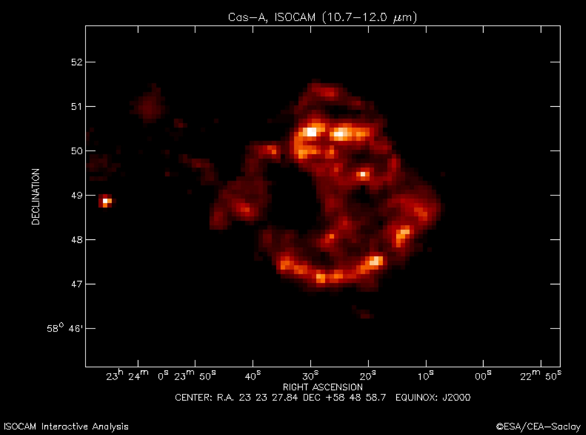A ring of bright blobs depicts newly created cosmic dust, in the vicinity of a massive star that blew up around AD 1680. This image of the supernova remnant called Cassiopeia A was obtained by ESA's Infrared Space Observatory ISO. It gives astronomers new insight into the processes in which newly-formed chemical elements, released by a stellar explosion, create dust as they cool. These products enrich the clouds of gas and dust between the stars and help to make possible the formation of planets and perhaps living things, in the vicinity of stars as yet unborn.