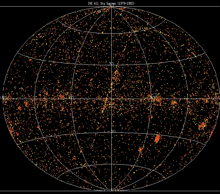 IUE all-sky survey (by camera) of all the images taken between 1978-1992 by IUE with the SWP (circa 1000 to 2000 Ångström) and LWP/R (circa 2000 to 3000 Ångström) cameras. This is an Aitoff projection of the positions of more than 80 000 images (about 8000 unique positions are visible) plotted in galactic coordinates. The galactic and ecliptic planes are easily detectable along with other galactic features as well as the Small and Large Magellanic Clouds. The SWP exposures are flagged as red, and the LWP/R exposures as yellow.