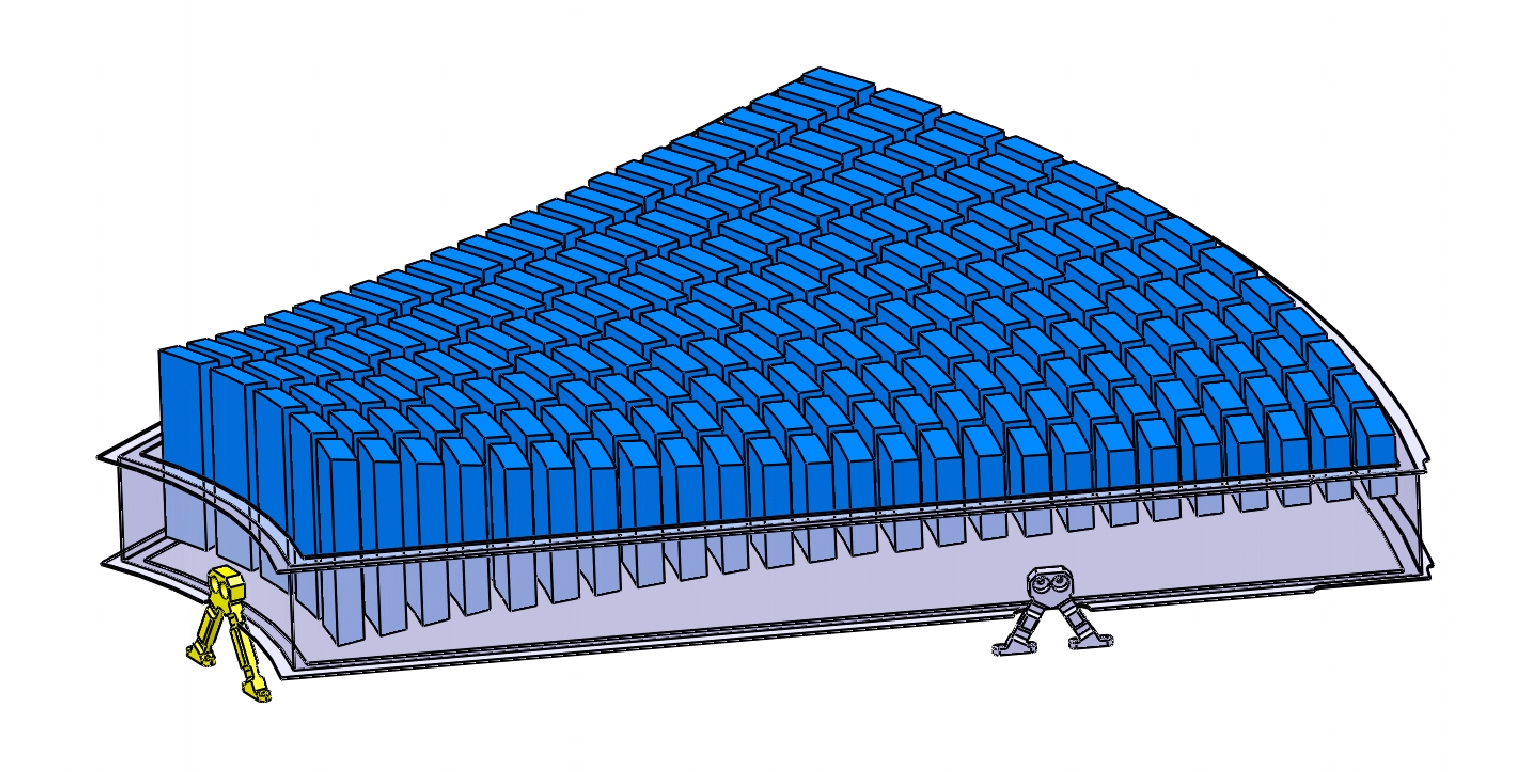 CAD drawing of one mirror petal (in grey) populated with mirror modules (in blue).