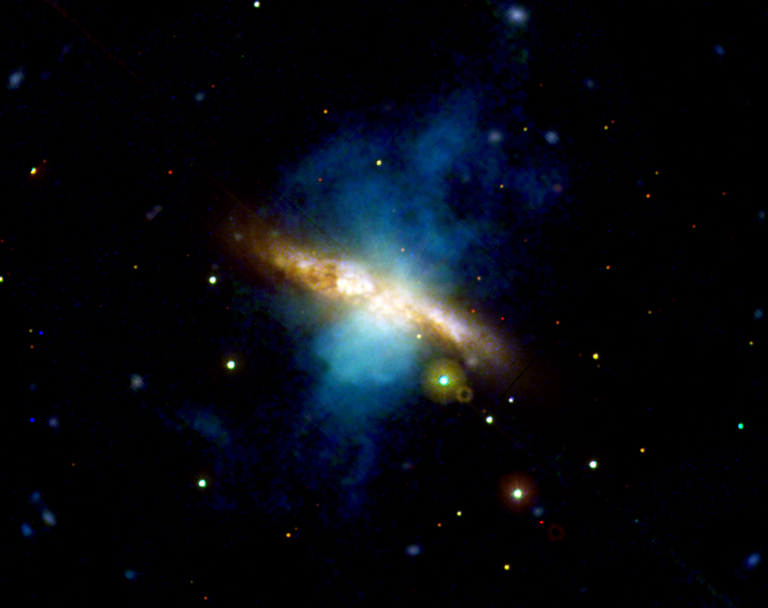To celebrate the International Year of Astronomy, and as part of the 100 Hours of Astronomy cornerstone project, the European Space Agency released this magnificent image of the starburst galaxy Messier 82 (M82) obtained with the XMM-Newton observatory. The image shows bright knots in the plane of the galaxy, indicating a region of intense star formation, and emerging plumes of supergalactic winds glowing in X-rays. (A poster version, showing also the separate components (optical/UV and X-ray), is also available - see "Messier 82 with XMM-Newton (poster)".)
