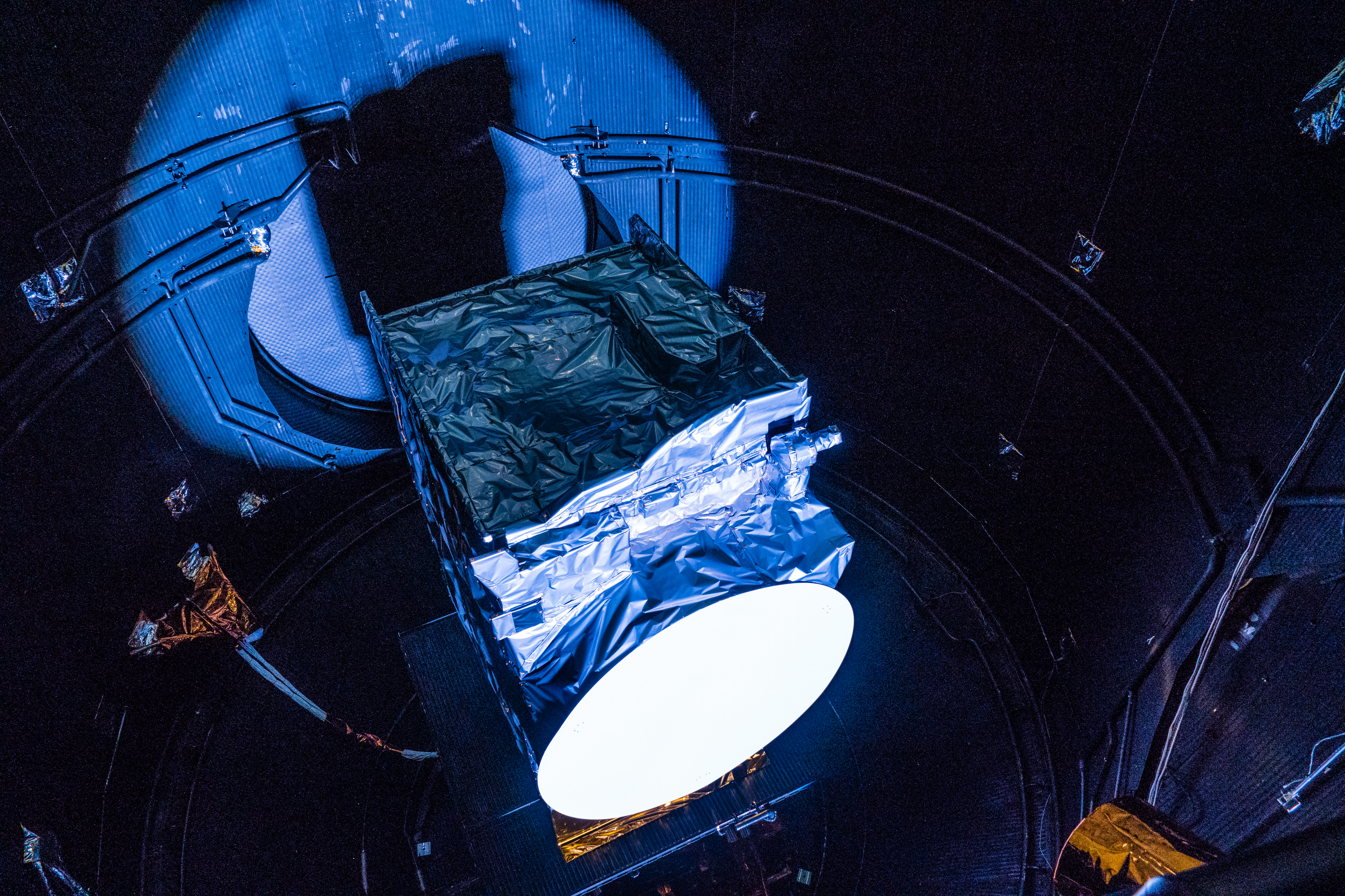 The JUICE Thermal Development Model (TDM) about to undergo thermal verification tests inside the Large Space Simulator at ESA's European Space Research & Technology Centre (ESTEC). The full size TDM, wrapped in Multi-Layer Insulation, was fitted with a white-painted, aluminium disc that represented its high gain antenna.