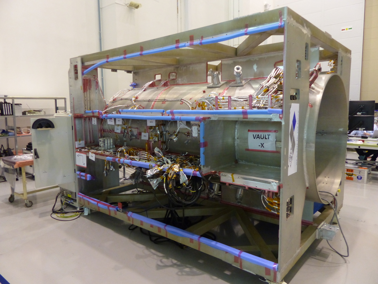 The engineering model of ESA's JUICE at the facilities of prime contractor Airbus Defence and Space in Toulouse, France. The central cylinder of the spacecraft is well visible in this view, along with the electrical harness.