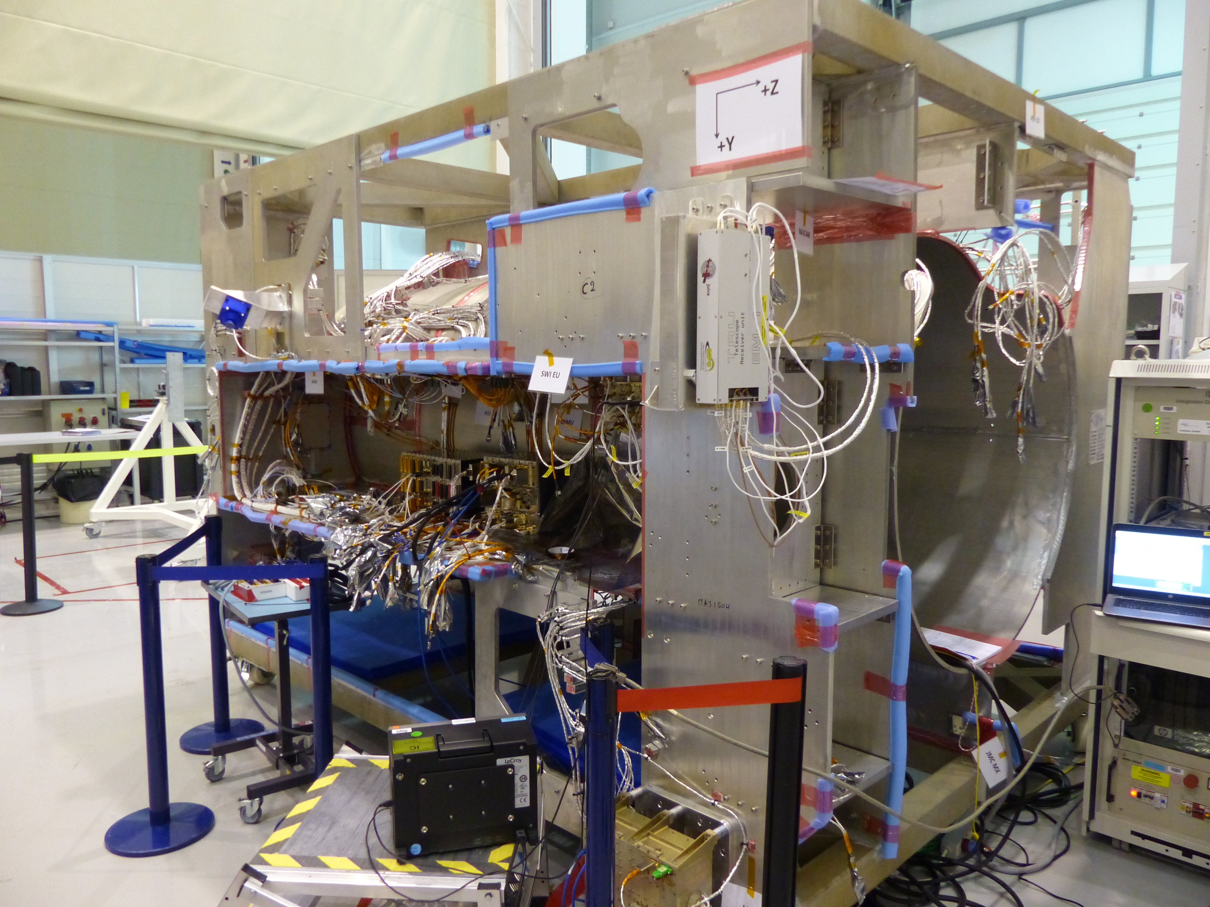 Engineering models of the JUICE instruments are being mounted and tested on two opposite sides (one of them visible in this view) of the engineering model spacecraft.