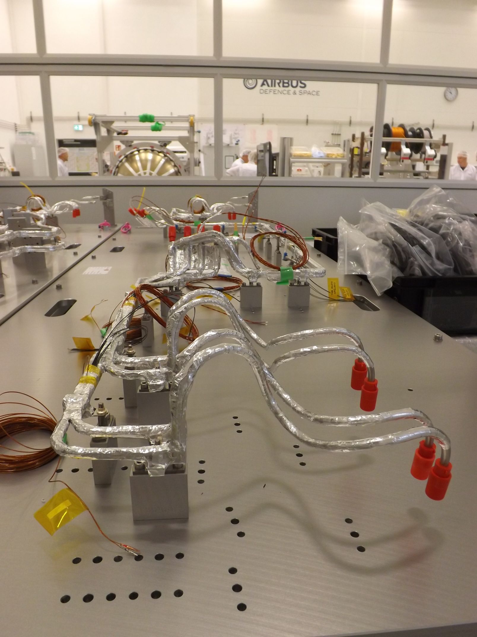 The integration of the spacecraft's propulsion system will, however, involve much more than installing two propellant tanks. Eventually, three fairly small tanks, each filled with helium pressurant, will be affixed around the exterior of the central cylinder, together with all the necessary plumbing. Some 130 metres of titanium piping, such as the tubes shown in this image, will also have to be installed and welded in the STSS.