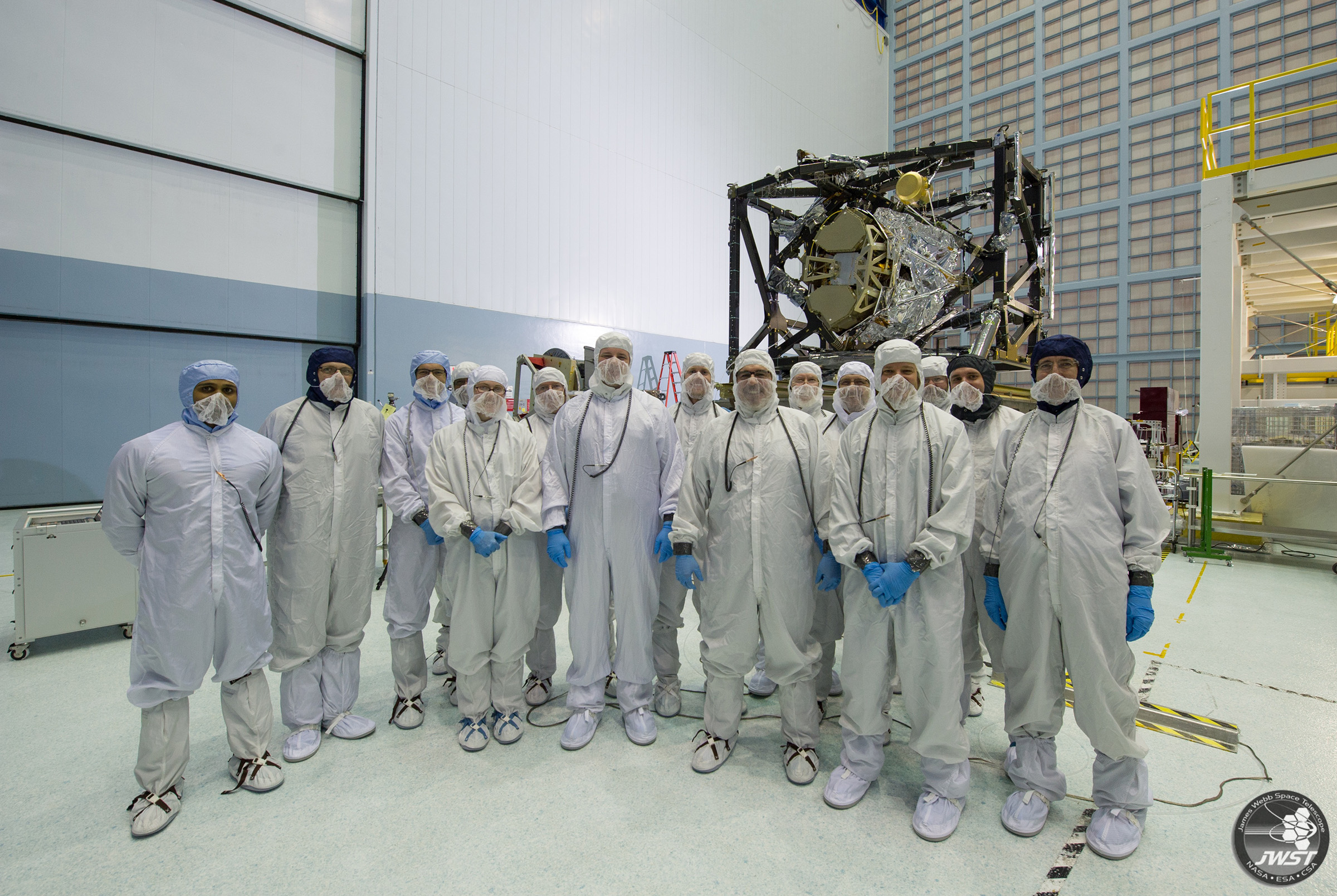 Pictured here are some of those involved in the integration process for MIRI. The people in blue caps are from ESA and the MIRI European Consortium: (from left to right) Piyal Samara-Ratna (MIRI European Consortium), Alan Pearce (MIRI European Consortium), Maurice te Plate (ESA), Paul Eccleston (MIRI European Consortium) and David Wright (NASA).