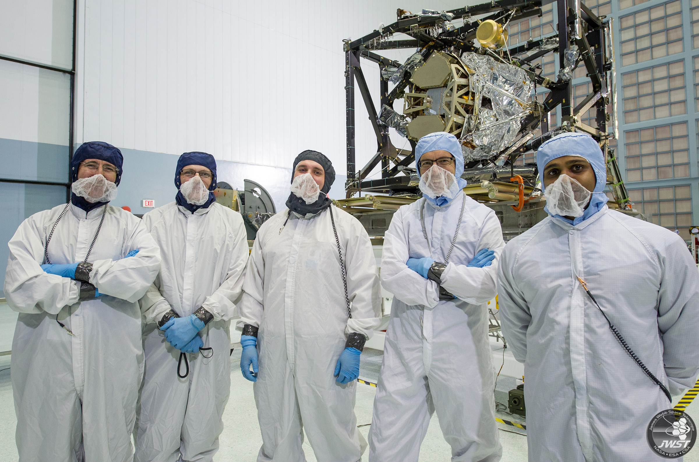 Pictured here are some of those from the MIRI European Consortium (EC) and ESA who were involved in the integration process: (from left to right) David Wright (NASA, MIRI instrument system engineer), Alan Pearce (MIRI EC, senior AIT engineer), Paul Eccleston (MIRI EC, AIV lead engineer), Maurice te Plate (ESA system integration and test manager) and Piyal Samara-Ratna (MIRI EC, mechanical engineer).