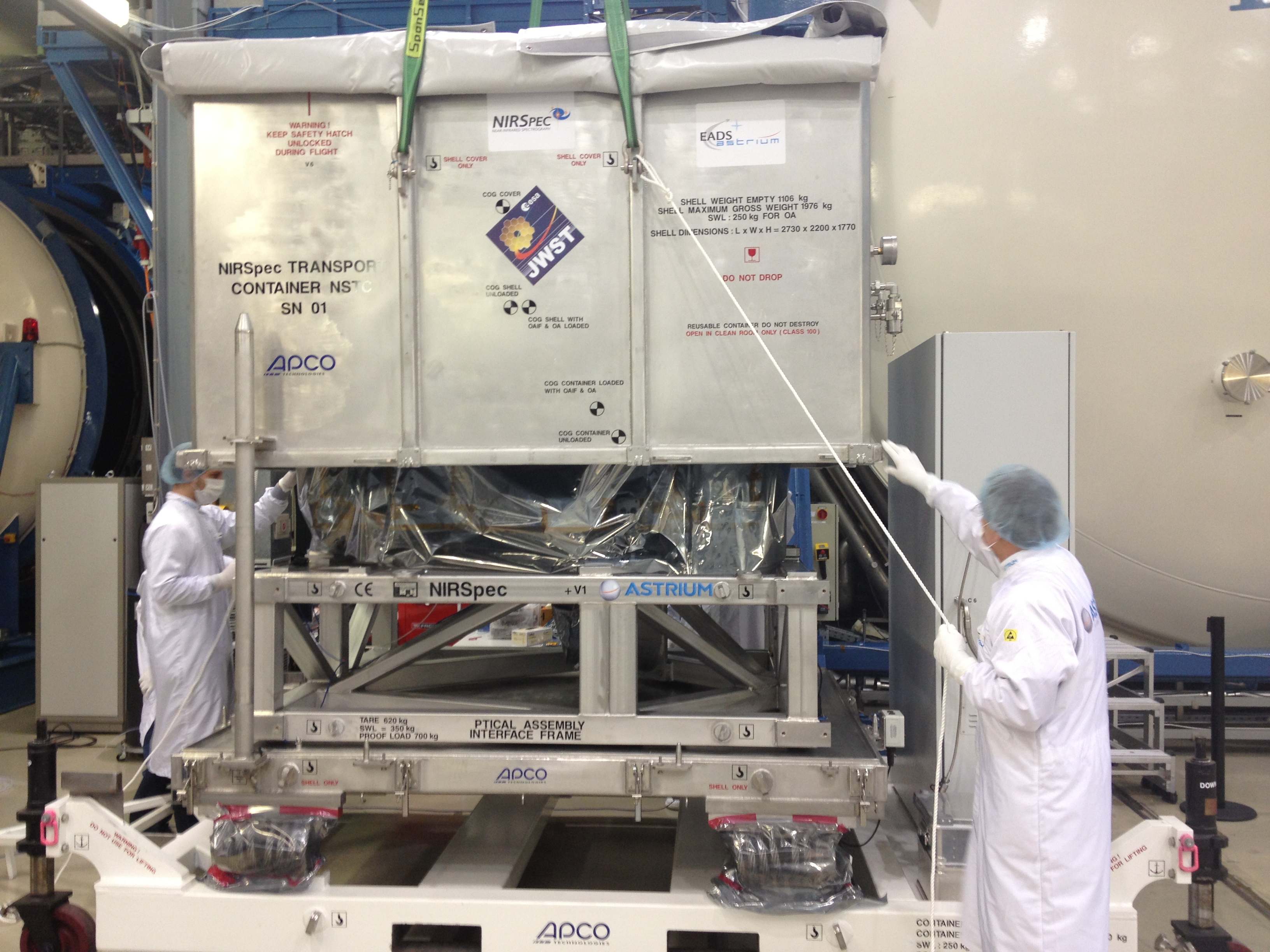 JWST's Near InfraRed Spectrograph (NIRSpec) cryogenic and vacuum test campaigns were undertaken at the IABG test facility in Germany. This shot shows engineers at IABG lifting the cover off a transport crate containing NIRSpec. The springs, in bags with red tape on them, separate the two APCO transport structures and isolate the NIRSpec box from vibrations and shock during transport. NIRSpec itself can be seen wrapped in grey foil-like multilayer insulation.