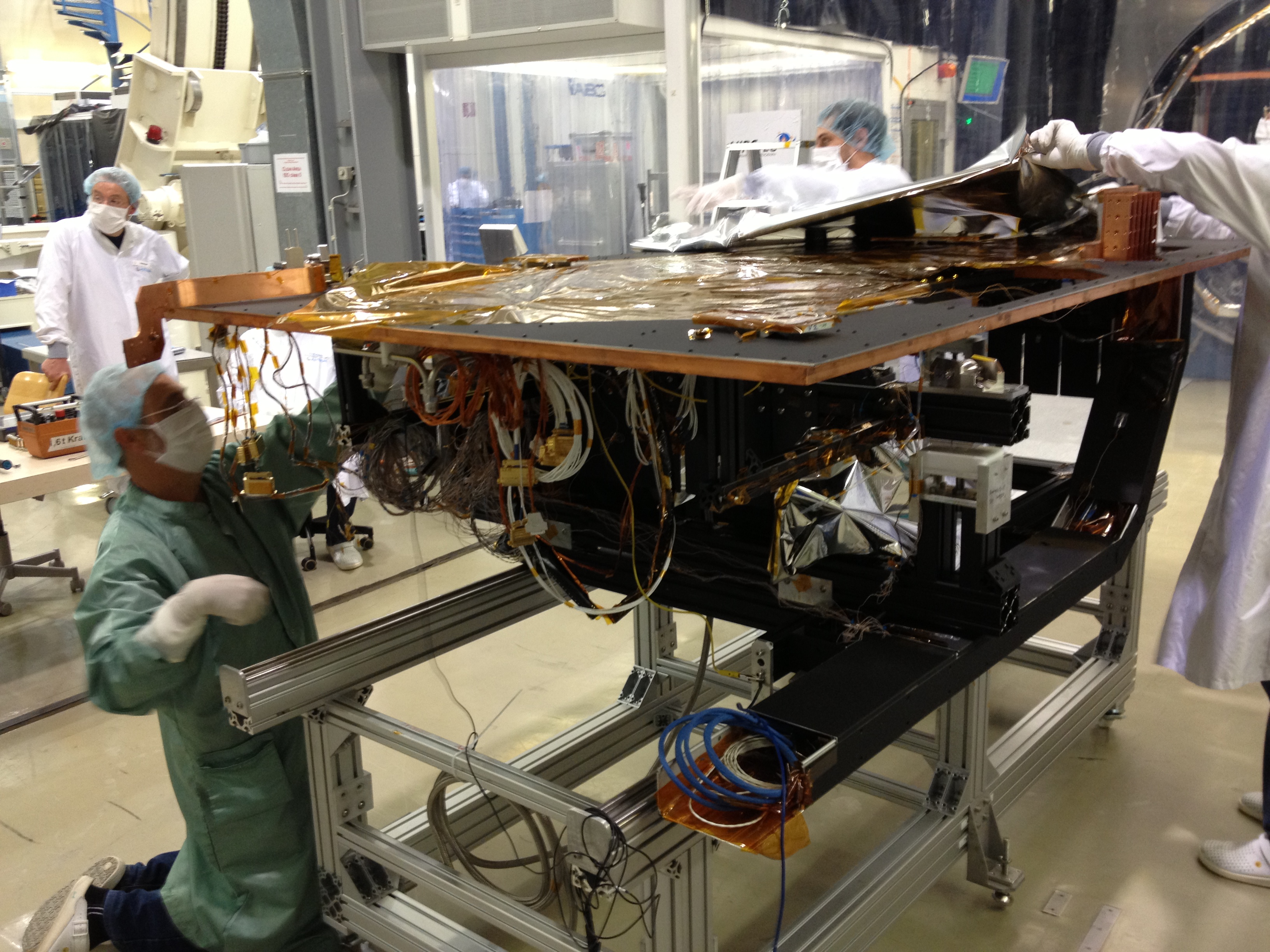 NIRSpec was installed on top of the support table seen in this picture. The copper coloured rim around the top of the table is the bottom part of the helium shroud which cools down and keeps NIRSpec at its operating temperature.
