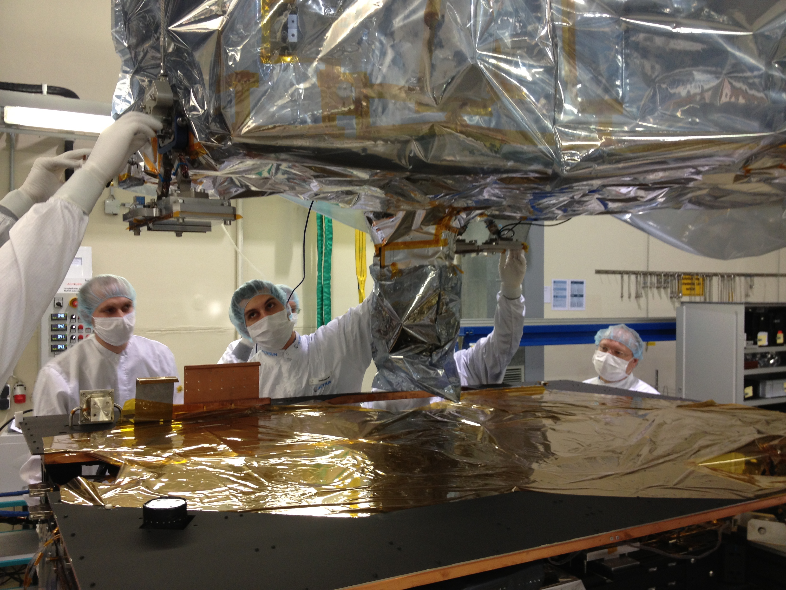JWST's Near InfraRed Spectrograph (NIRSpec) cryogenic and vacuum (cryo-vacuum) test campaigns were undertaken at the IABG test facility in Germany. This photo shows the installation of NIRSpec onto the "support table", which rolls into the cryogenic test chamber.  While bringing NIRSpec to the table, it is not possible to have the "clean tent" present, so NIRSpec is "bagged" in a protective grayish multilayer insulation (MLI) cover. The actual flight MLI, a silver colour with goldish tape, can be seen through the "bag".