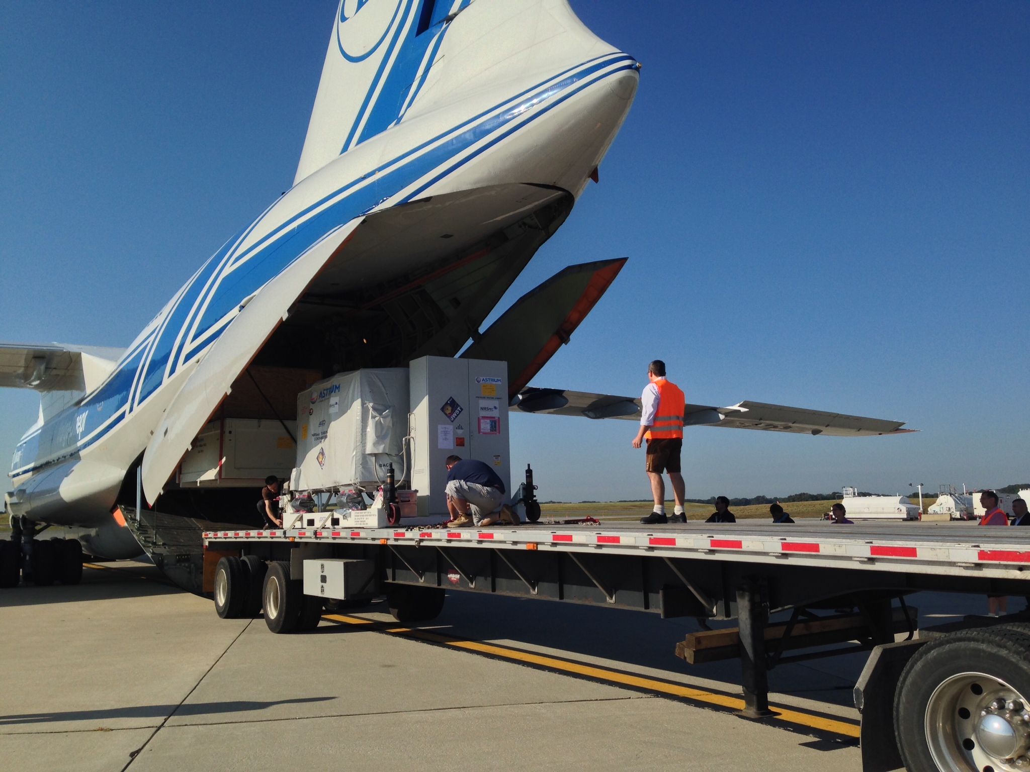 NIRSpec (the Near InfraRed Spectrograph) is offloaded at Baltimore Washington International airport in Maryland on 20 September 2013 following its flight from Munich.