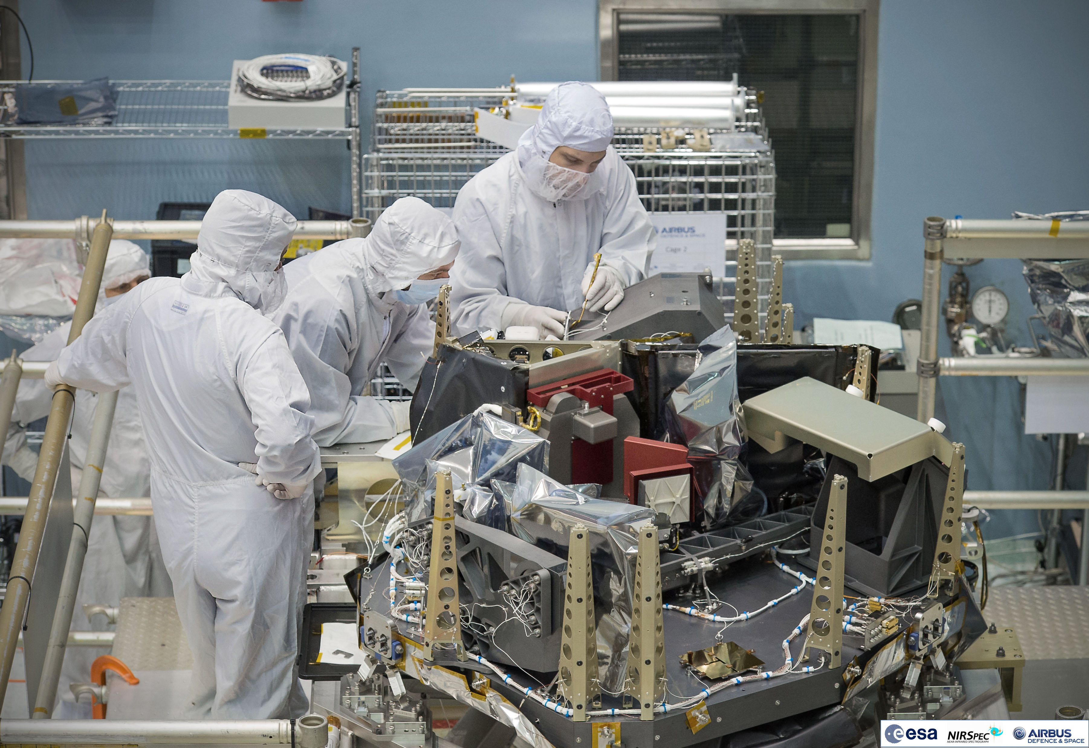 Team members working on the replacement of the JWST NIRSpec instrument focal plane assembly (FPA). The cover of NIRSpec has been removed and various devices (bags, covers, etc.) have been installed to protect the optical elements and the microshutters.