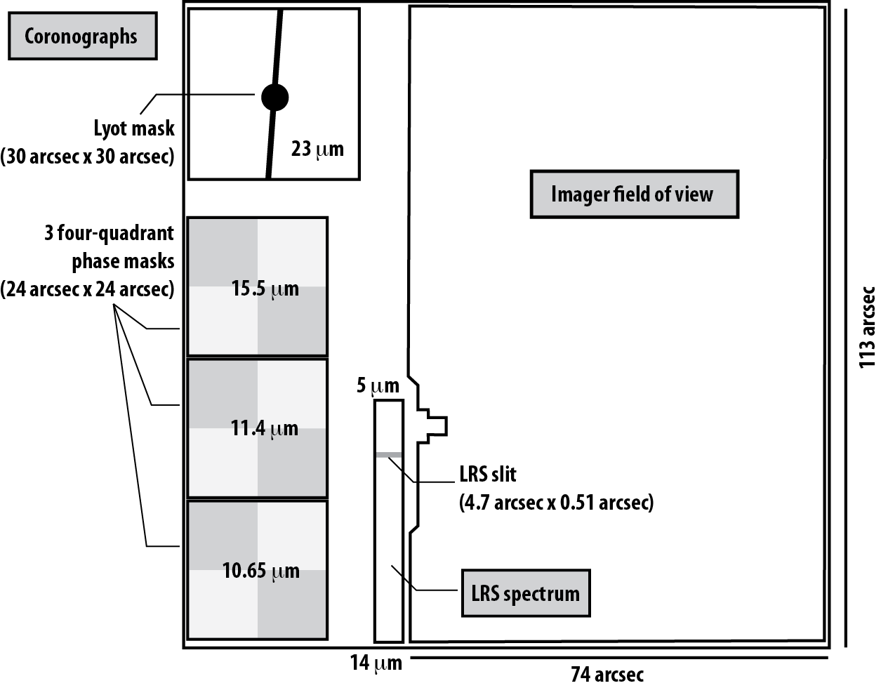 The coronagraphic masks each have a square field of view of about 24" × 24" for the phase masks and about 30" × 30" for the Lyot coronagraph. They are optimized for particular wavelengths (10.65, 11.4, 15.5 and 23 μm) with each coronagraph uniquely associated with a specific filter.