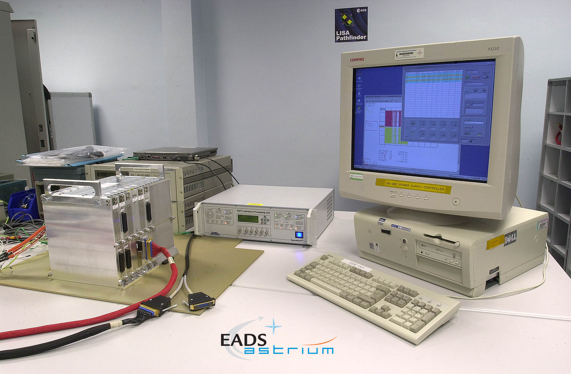 The LISA Pathfinder embryonic Real-Time Test Bench, showing the On Board Computer Development Model, the Telemetry and Telecommand Front End and one display of the Check-out System.