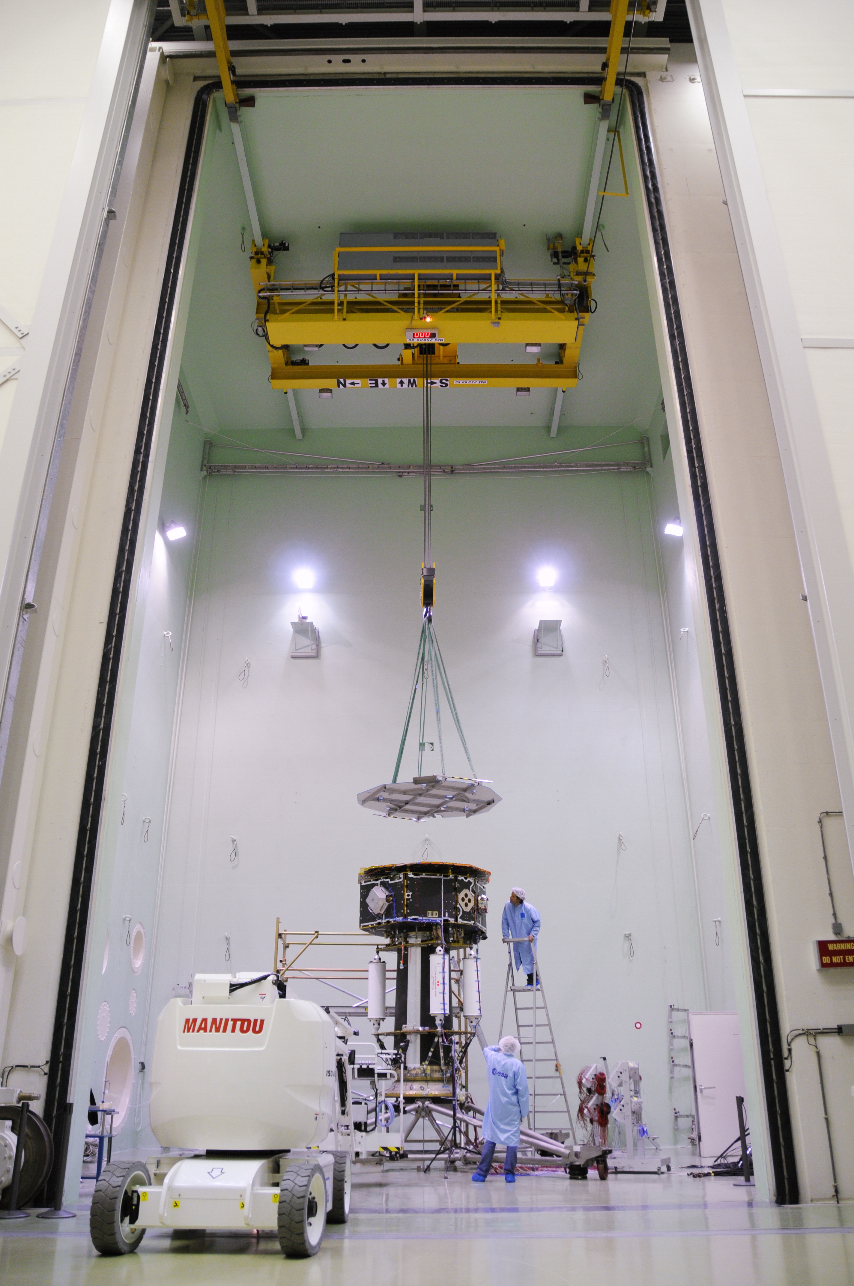 Depicts: Solar array protection cover being removed from LISA Pathfinder prior to acoustic tests