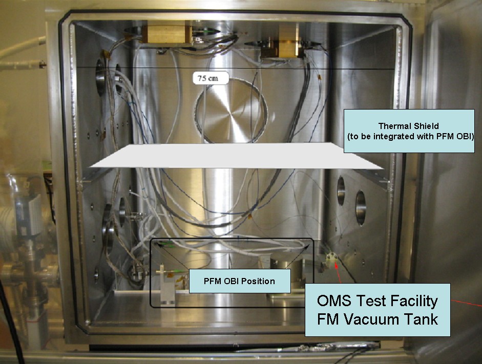 This flight model vacuum tank provides the required vacuum and thermal conditions for the LISA Technology Package reference laser unit (RLU) and the laser modulator unit (LMU); these are mounted inside, on the top of the tank. The location of the optical bench interferometer during the optical metrology subsystem test campaign is indicated in the photograph.