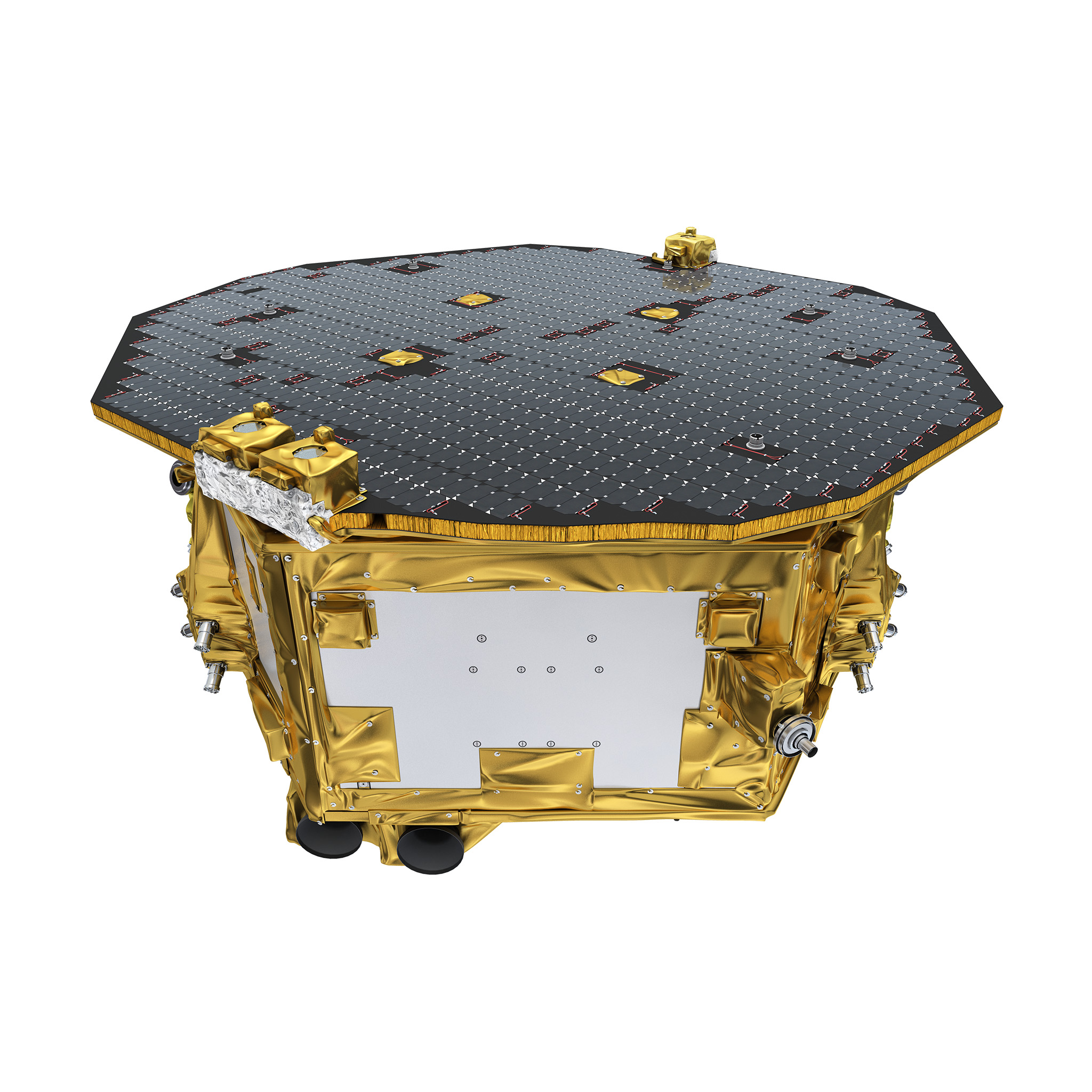 The white and gold coloured element of LISA Pathfinder shown in this artist's impression is the spacecraft's science module, covered in multi-layer insulation. As well as housing all the scientific support systems needed to carry out a range of experiments, the octagonal module contains many of the key elements of LISA Pathfinder's payload, including two test masses, each in a vacuum enclosure, and an optical bench interferometer between them.