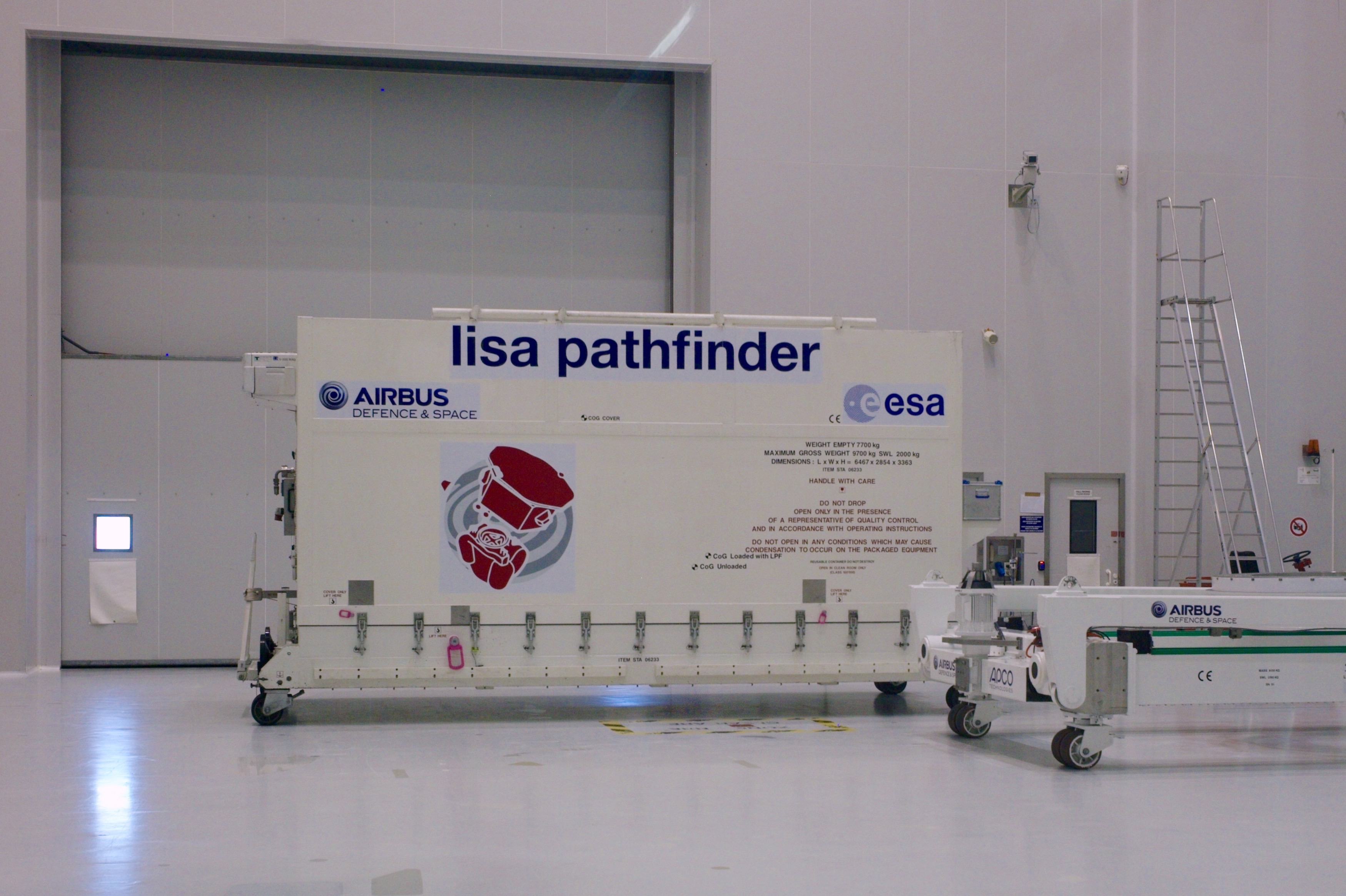 The LISA Pathfinder transport container pictured in a preparation room in building S5C at the Centre Spatial Guyanais. The spacecraft arrived in Kourou on 8 October.