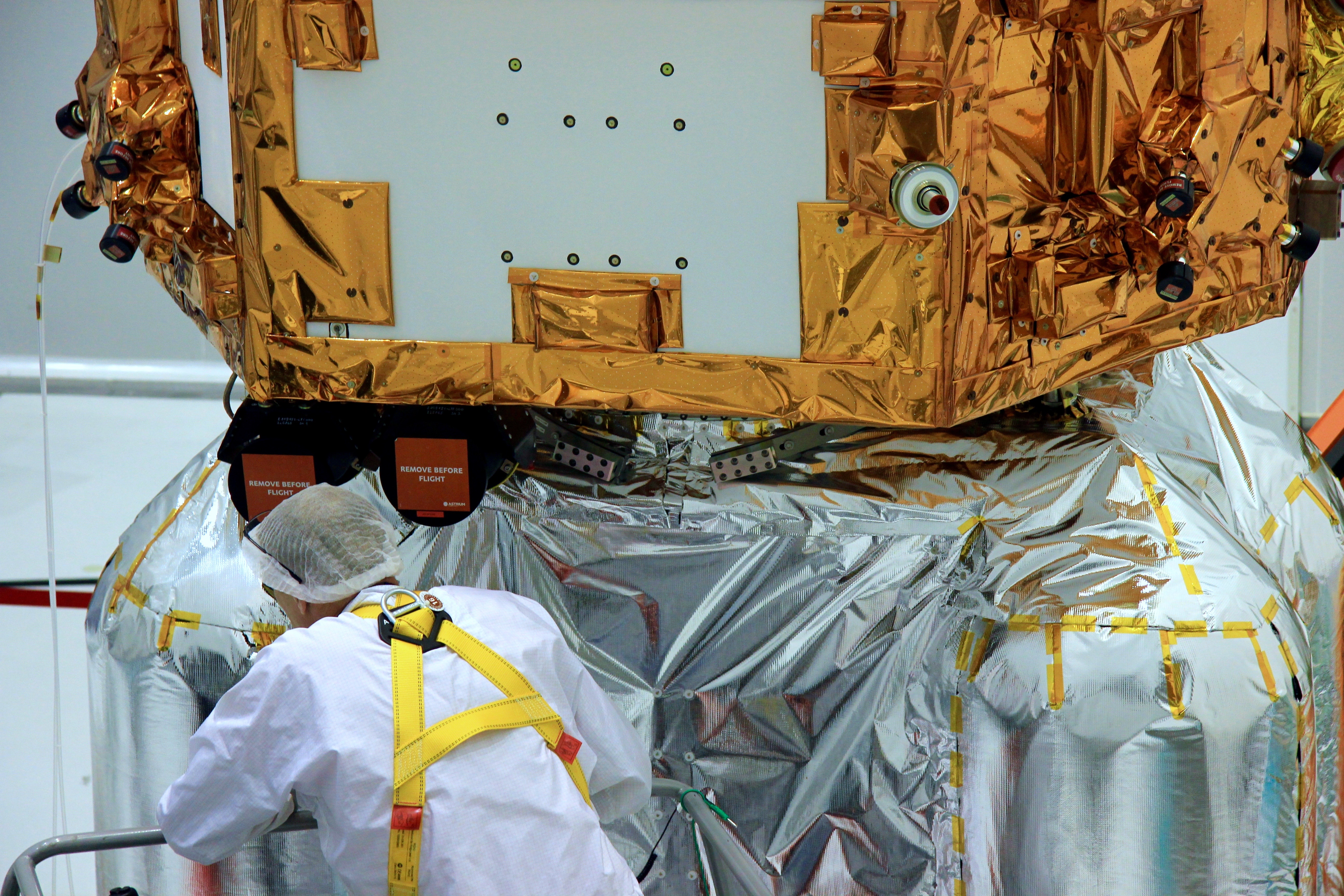 The ground clamp-band, between the LISA Pathfinder science (above, gold-coloured) and propulsion (below, silver-coloured) modules, is opened prior to removal and replacement by the flight clamp-band.