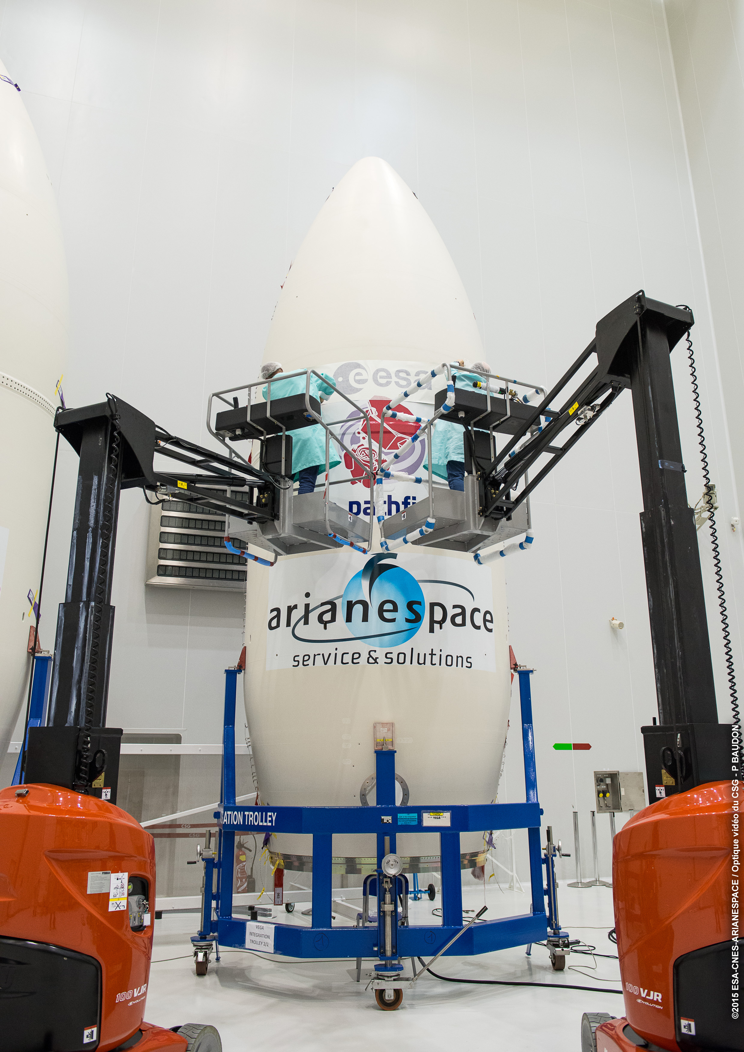 LISA Pathfinder will launch on Arianespace flight VV06 – the sixth launch of Europe's small Vega launcher – on 2 December 2015. The fairing for that launcher is seen here as the mission logo is being applied.
