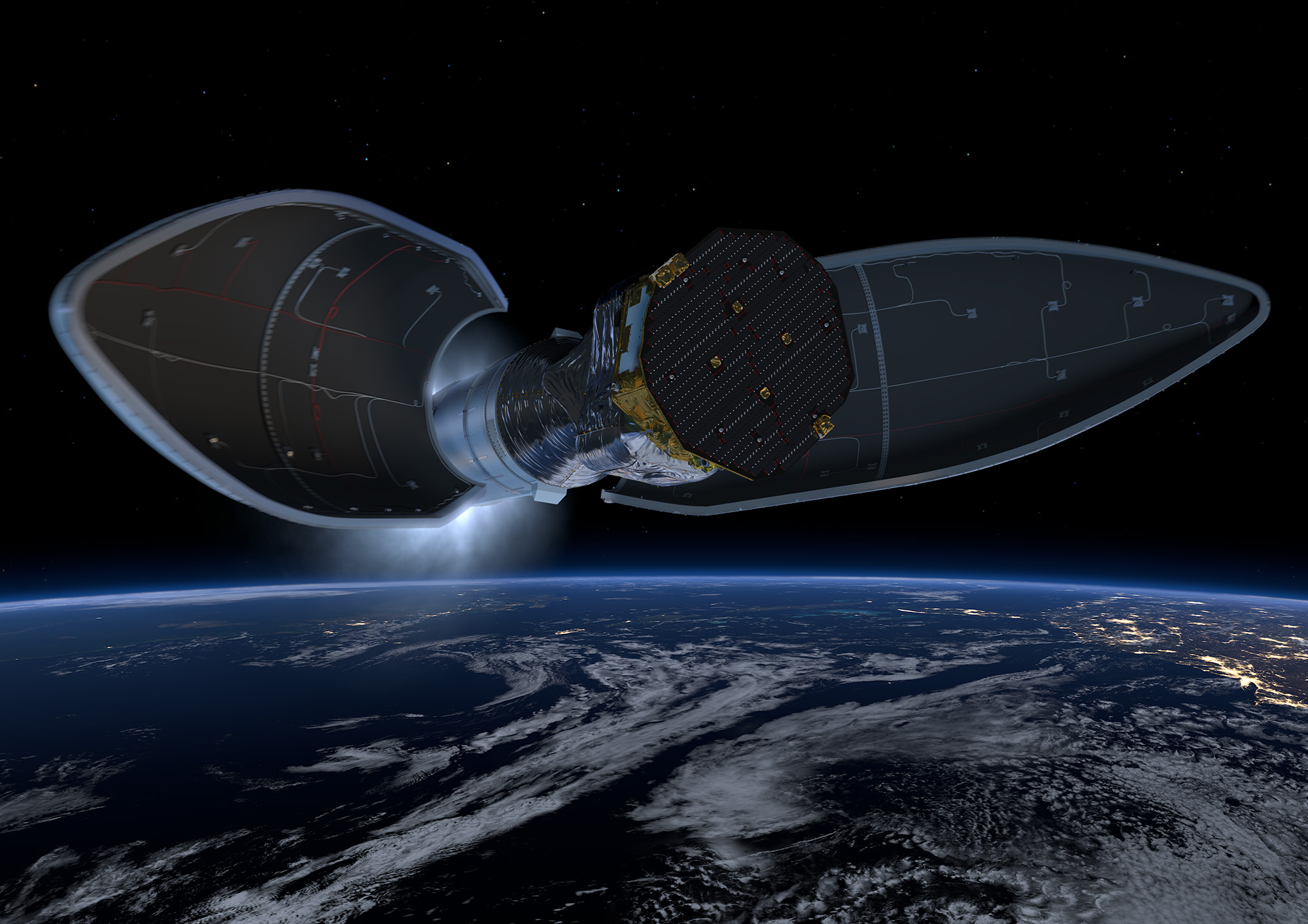 Artist's impression of the Vega rocket carrying LISA Pathfinder into orbit, showing the moment the aerodynamic fairing is jettisoned.