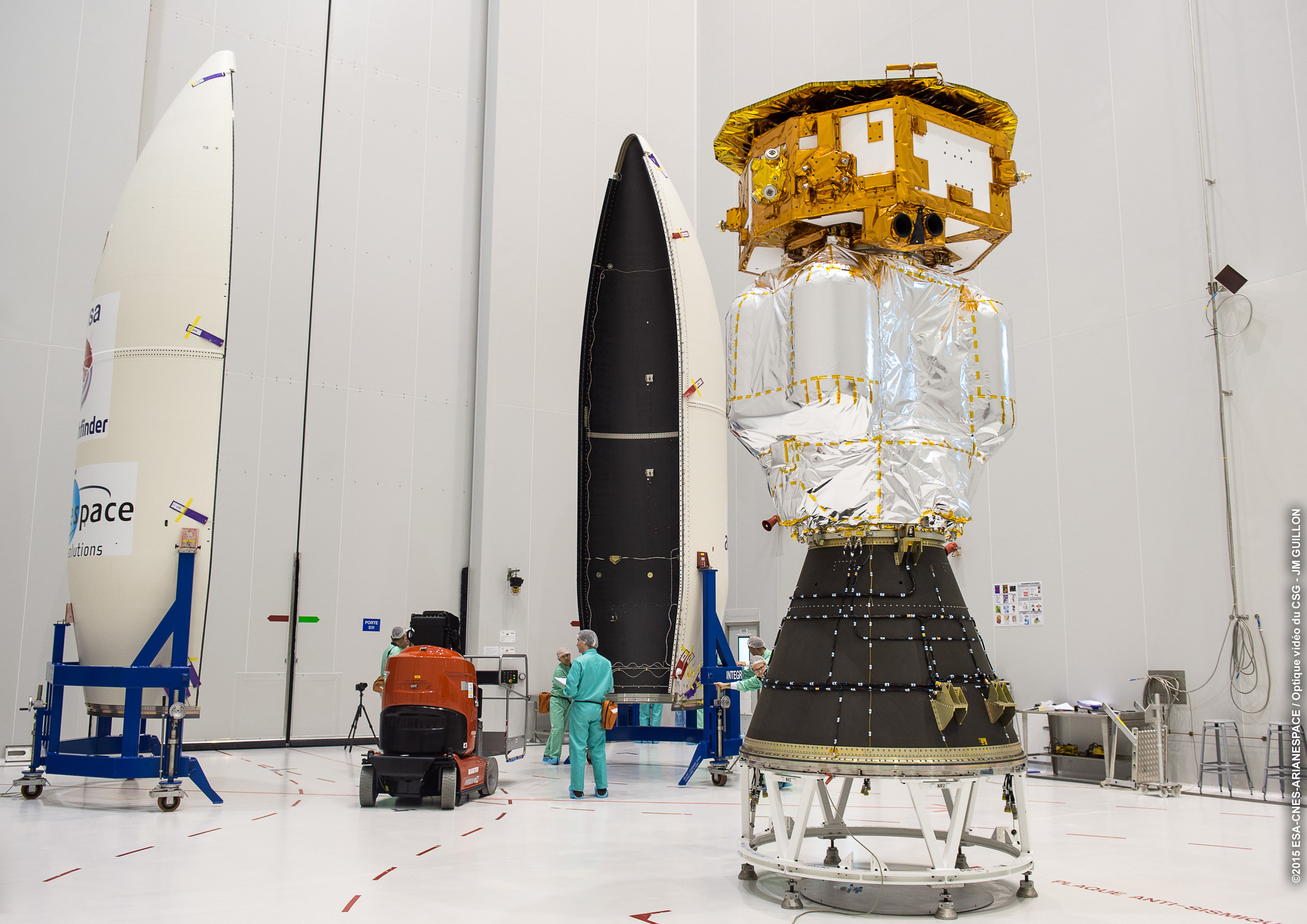 LISA Pathfinder being encapsulated within the half-shells of the Vega rocket fairing on 16 November 2015, at the Centre Spatial Guyanais in Kourou, French Guiana.