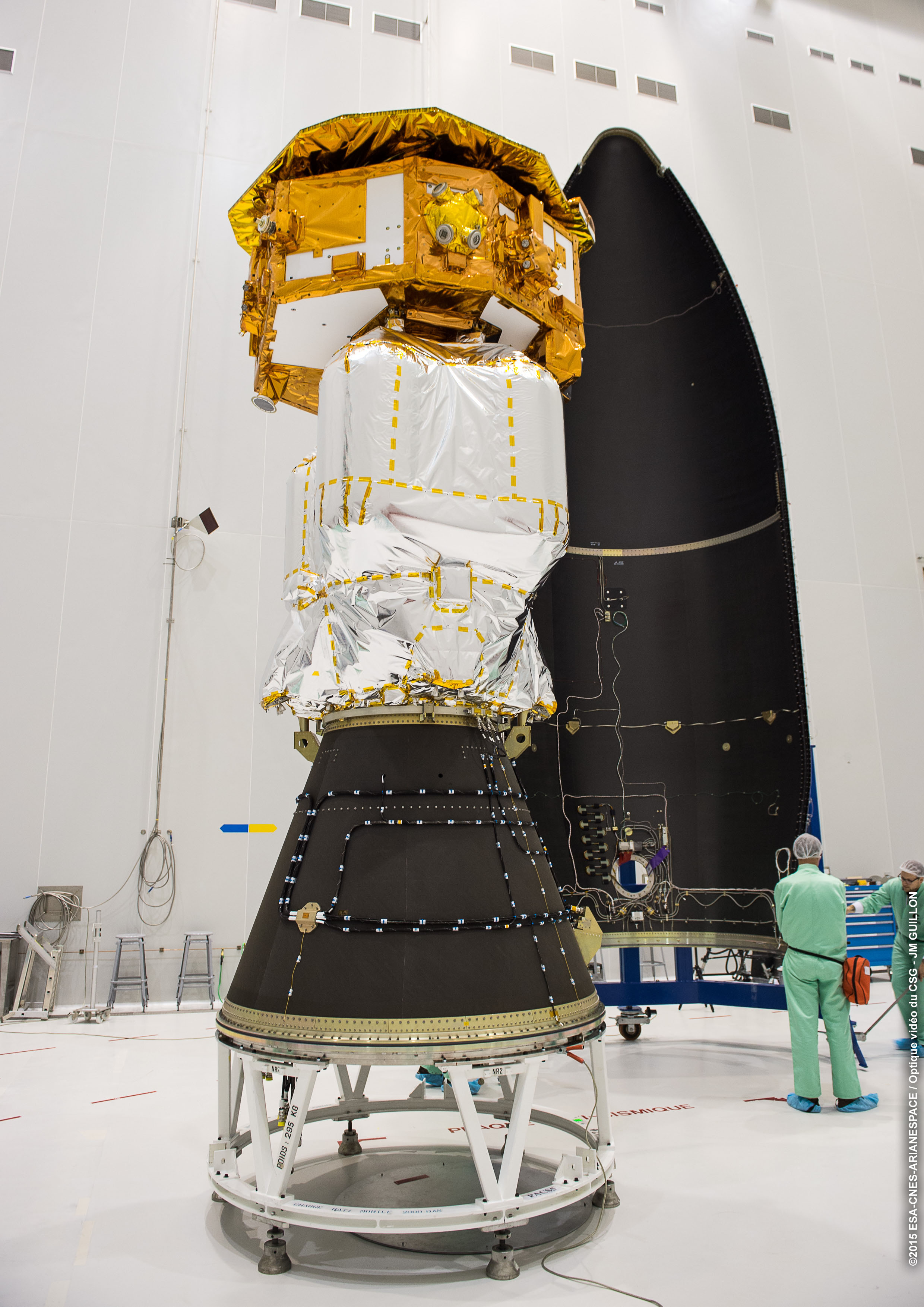 LISA Pathfinder being encapsulated within the half-shells of the Vega rocket fairing on 16 November 2015, at the Centre Spatial Guyanais in Kourou, French Guiana.