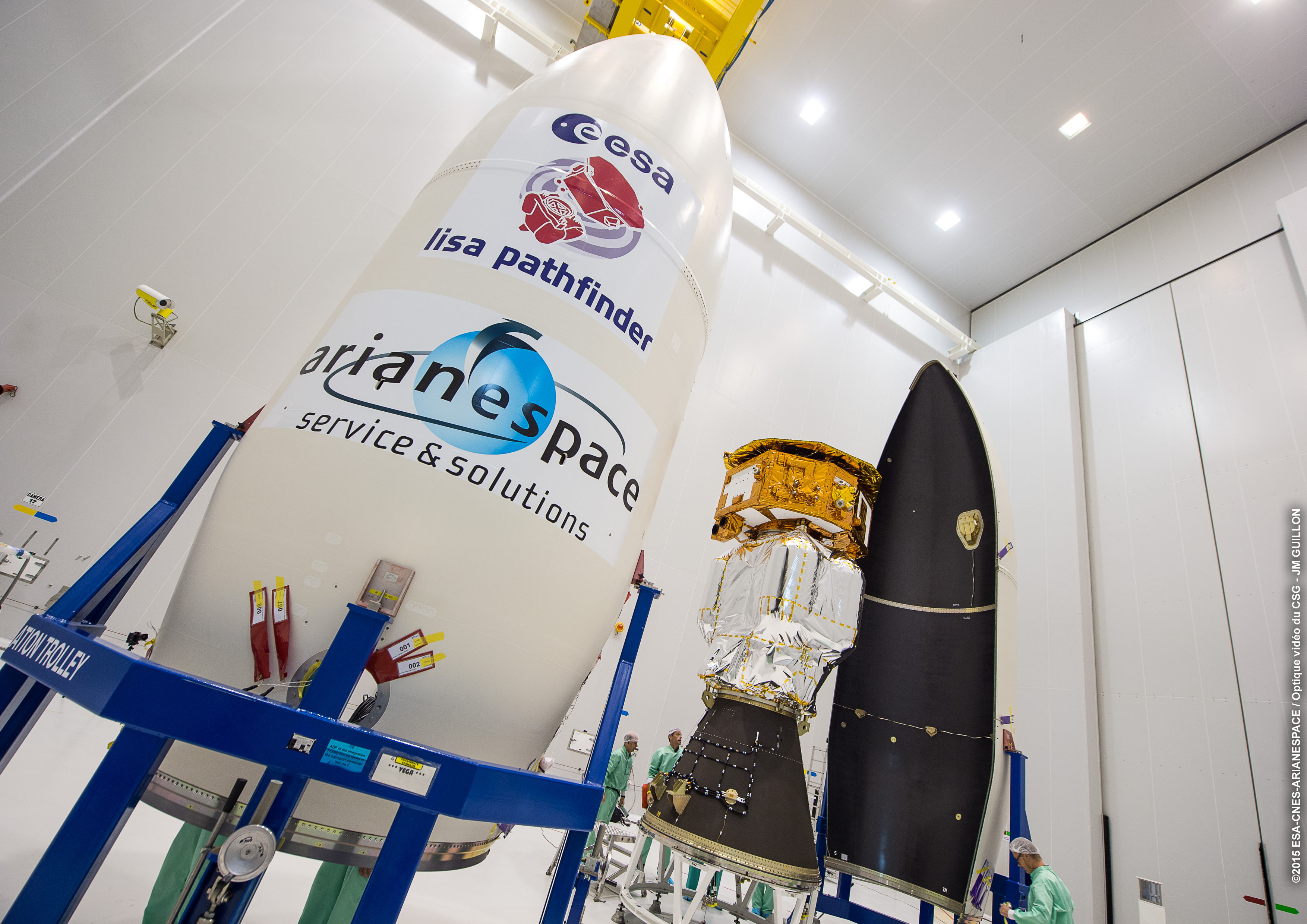 LISA Pathfinder being encapsulated within the half-shells of the Vega rocket fairing on 16 November 2015, at the Centre Spatial Guyanais in Kourou, French Guiana.